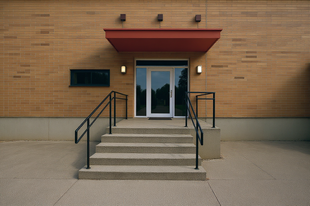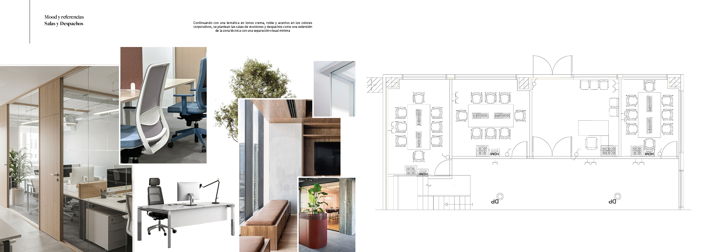 sunny office spaces featuring meeting rooms separated from the corridor by glass panels with minimal framing in the corridor we see a portion of the staircase going down the meeting room doors are full height oak wood running from floor to ceiling the overall decor is simple and typical of a technical office with red bold accent elements and abundant large greenery inside the meeting rooms adopt a more sober and elegant style with darker wood used in decorative elements white lacquered work tables and office chairs in grey tones vegetation in these rooms is minimal realistic architectural visualization