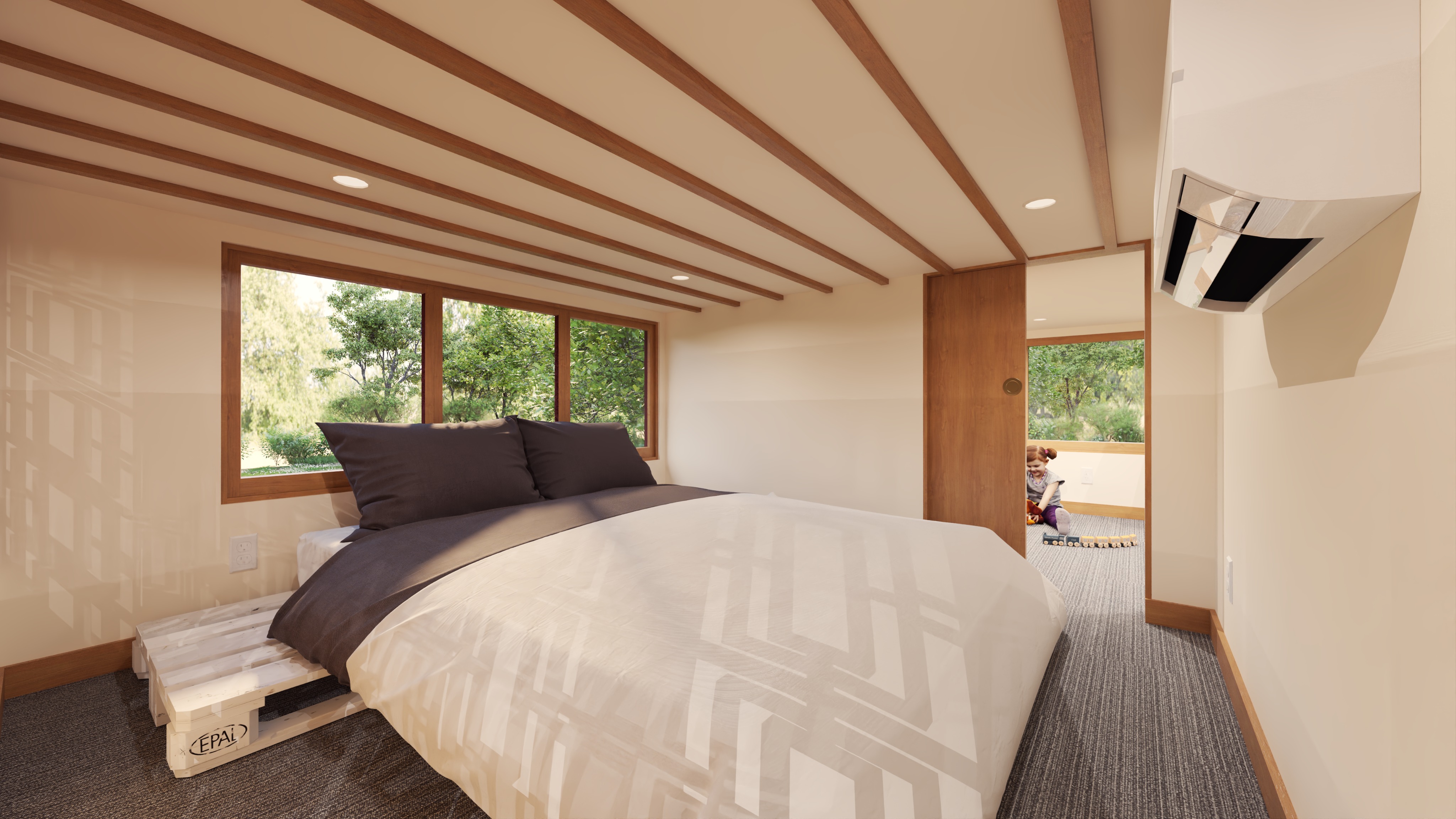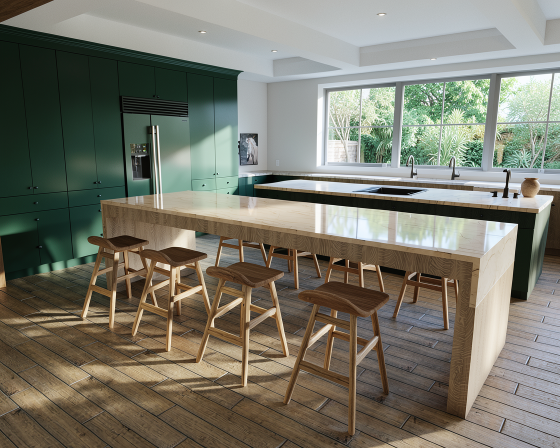 photorealistic interior architectural photography warm natural daylight and illuminated can lights in the ceiling soft directional light with realistic shadow falloff and gentle contrast bright but warm atmosphere realistic global illumination with subtle ambient occlusion in corners and at material transitions dslr with a 35mm lens eye level perspective professional architectural composition and framing and realistic depth slight depth of field foreground and midground in focus background softly flailing off physically based materials throughout with enhanced texture detail natural surface variation and subtle imperfections with realistic sheen high quality windows with realistic thickness subtle reflections of the interior soft exterior reflections and accurate light transmission windows feel transparent exterior visible through windows feels real and grounded with natural daylight realistic trees and landscape interacting with the light warm color temperature balanced with natural daylight soft highlights realistic shadows gentle contrast subtle camera noise natural exposure not overly sharp soften corners and edges professional photography style do not change the geometry of the image remove the people from the image