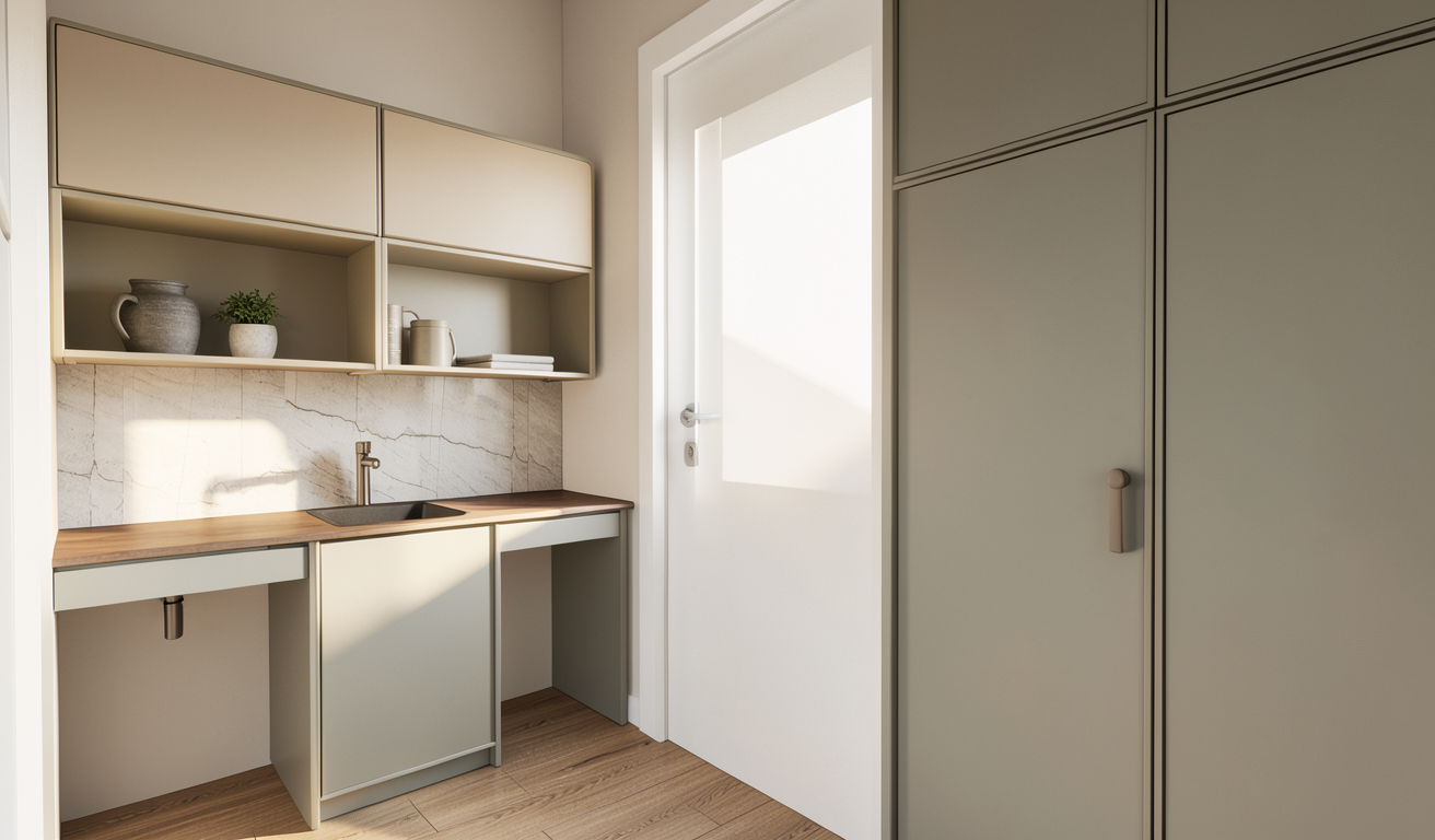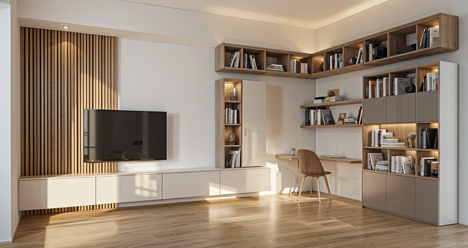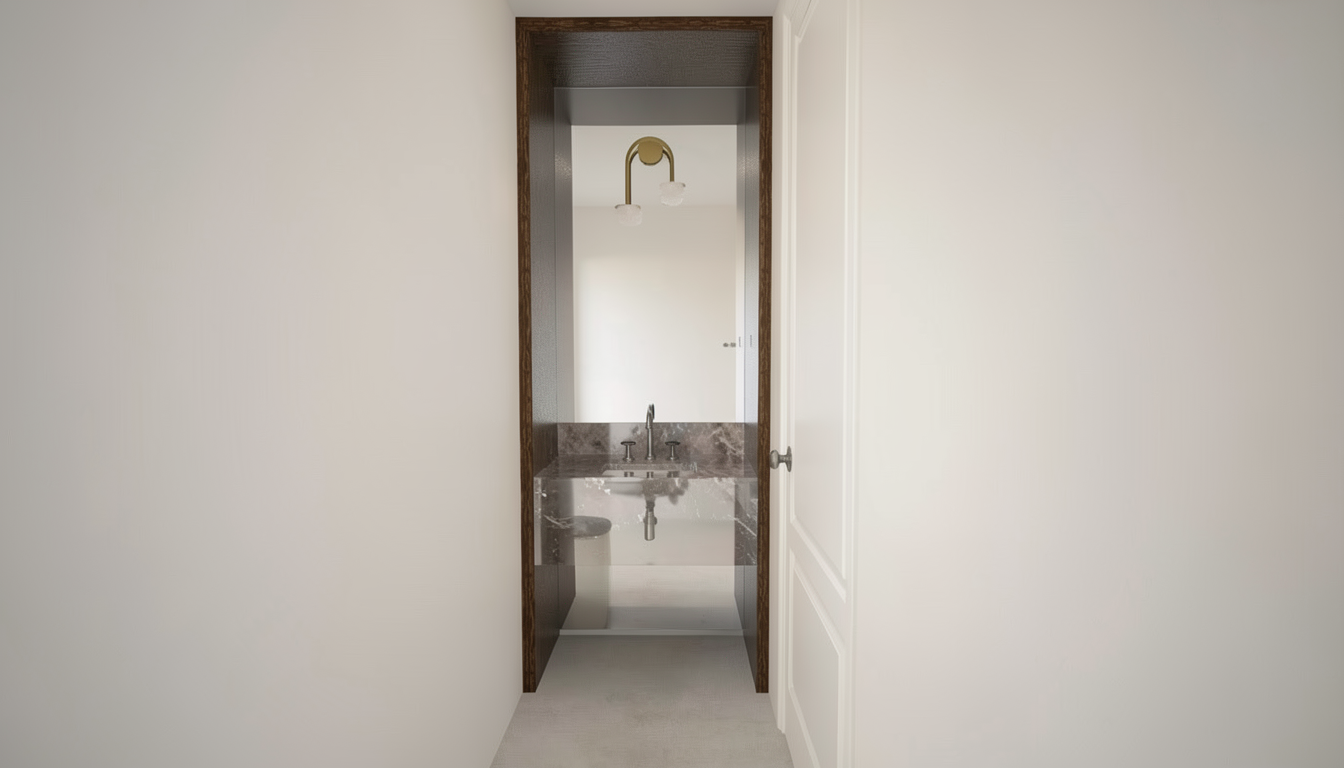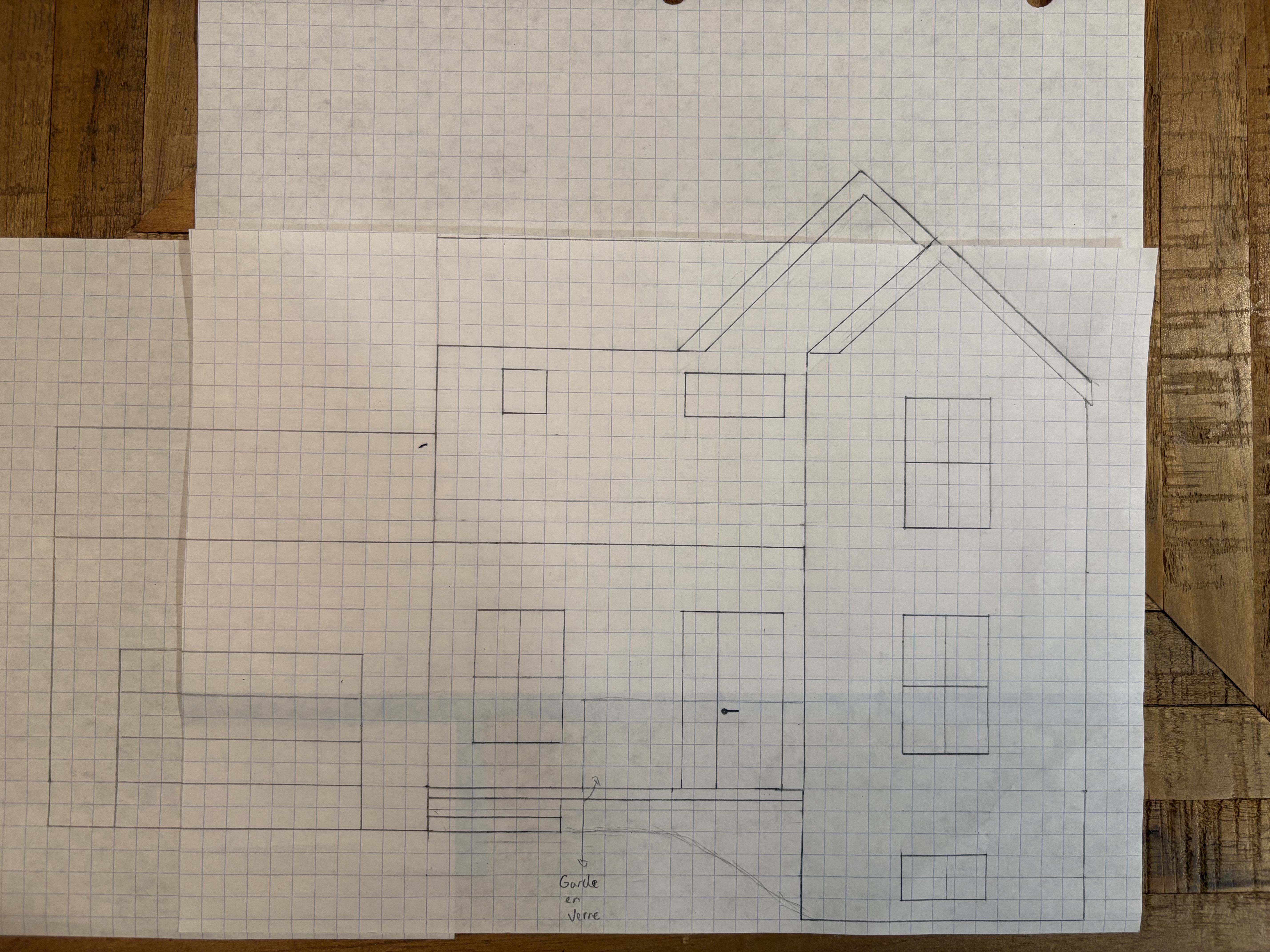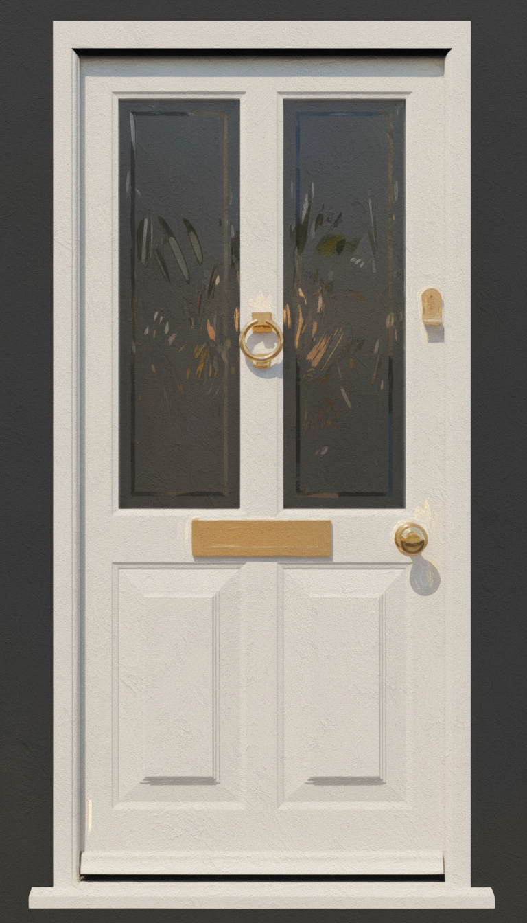 render a modern two story house with a minimalistic design use a soft white for the walls and light gray for the roof incorporate large windows with a slight tint of blue design a sleek wooden front door with a dark walnut finish create a welcoming front yard with a narrow stone path surrounded by lush green grass and small decorative shrubs add an atmosphere of a sunny day with clear blue skies casting gentle shadows around the house for a warm and inviting ambiance architecture