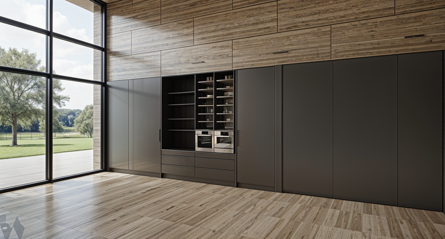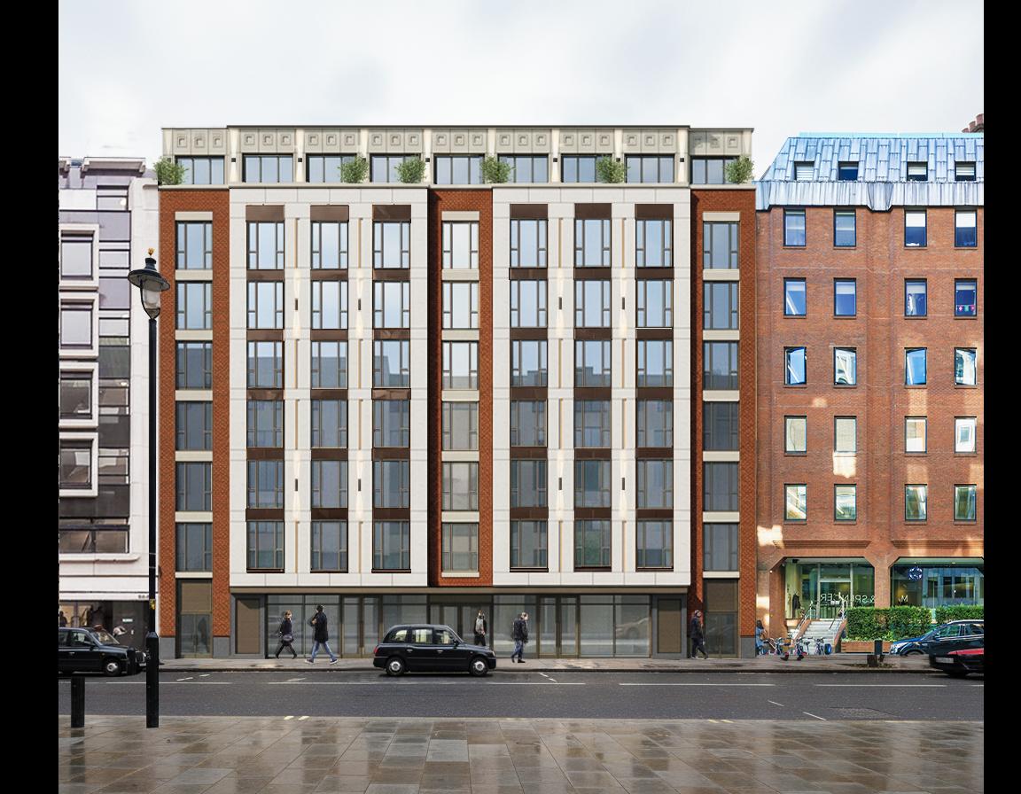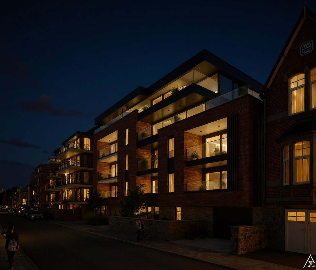 modernist exterior shot render this building in a different perspective with limestone facade slightly infront of brick facade and bay windows wher windows are project 70cm in front of the building architecture