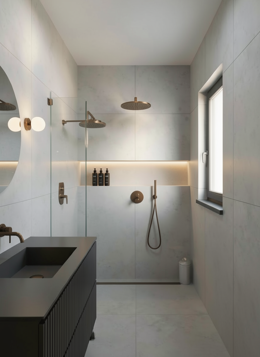 remove shower head on back wall and show black appliances