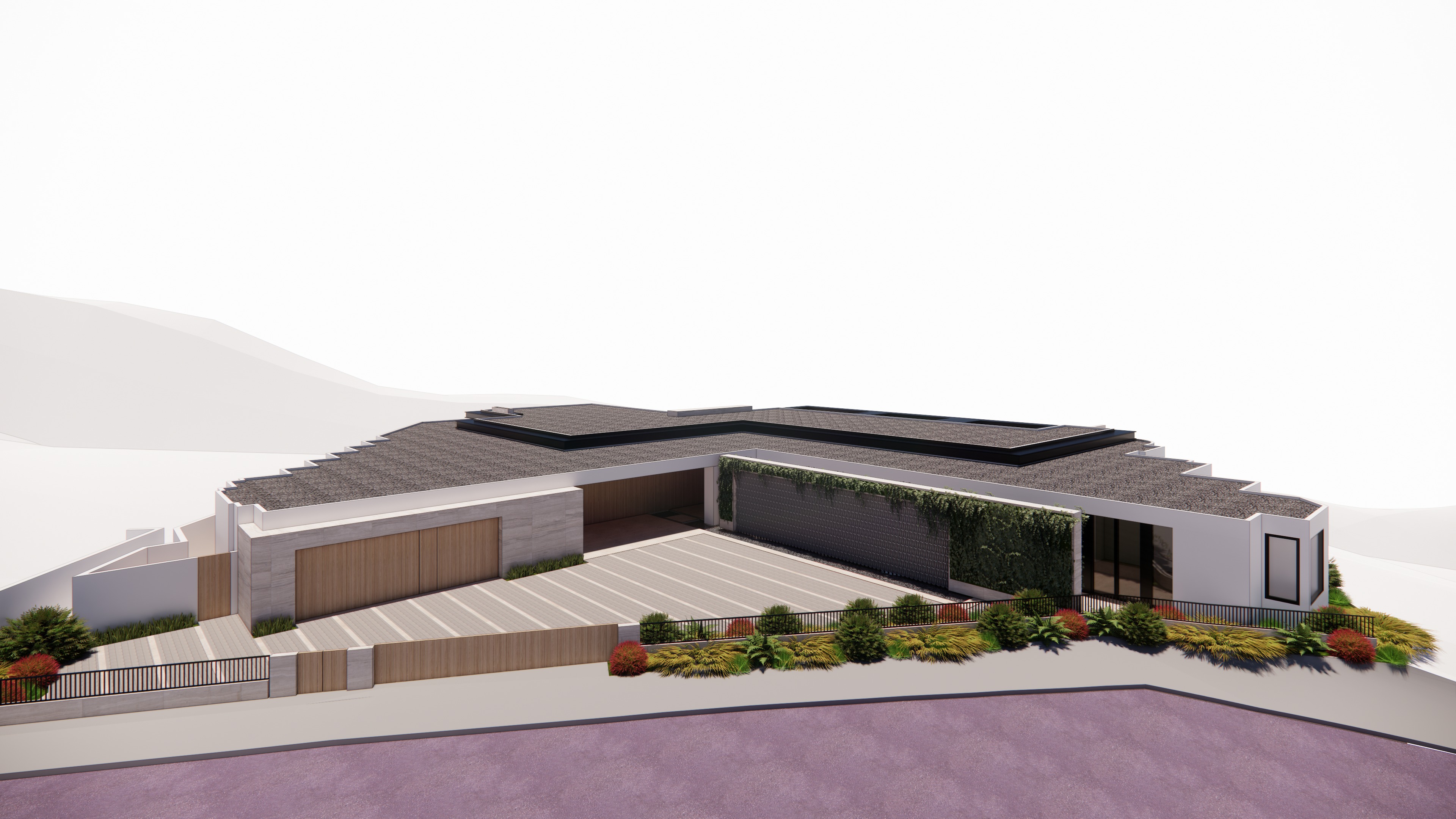 create a photorealistic rendering do not change the view angle this is the entry driveway it has a long wood panel sliding entry door from the street 42 high the driveway is made of gray cobblestones with limestone stripes the garage has travertine stone tile finish and wood panel doors with planters on each side of the wood panel doors the planters are not raised but rather aligned with the floor level on the right side there is a long and tall travertine stone wall with an opening that is filled with rectangular breeze blocks this wall is covered with plants green wall this wall sits on a shallow water feature the water feature continues beyond into the covered area this covered area is flat no steps don t add any labels