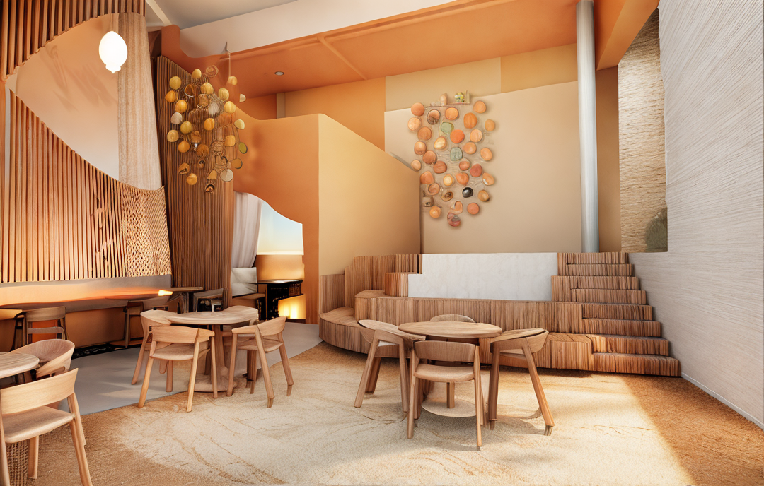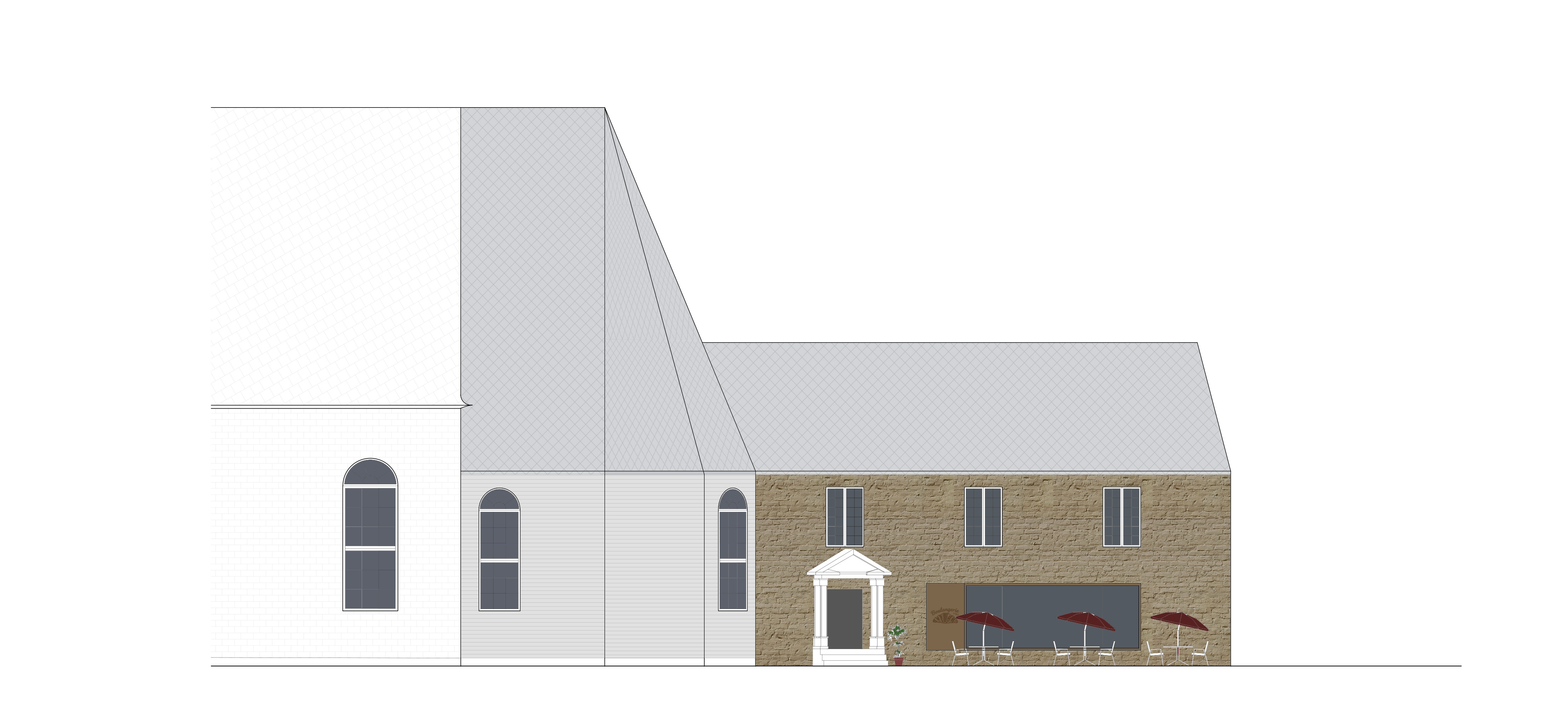 architectural hand sketch rendering of a bakery with a metallic roofs drawn in the style of an architect s copic marker concept sketch use the same colors and texture as the picture windows should cool blue reflections render expressive freehand linework with visible marker streaks and layering emphasizing depth and tone and a soft blue sky wash behind the overall composition should feel energetic balanced and artistic like a presentation board sketch add wood texture to the grey walls the white part of the building has a beige brick wall and the same metallic roof