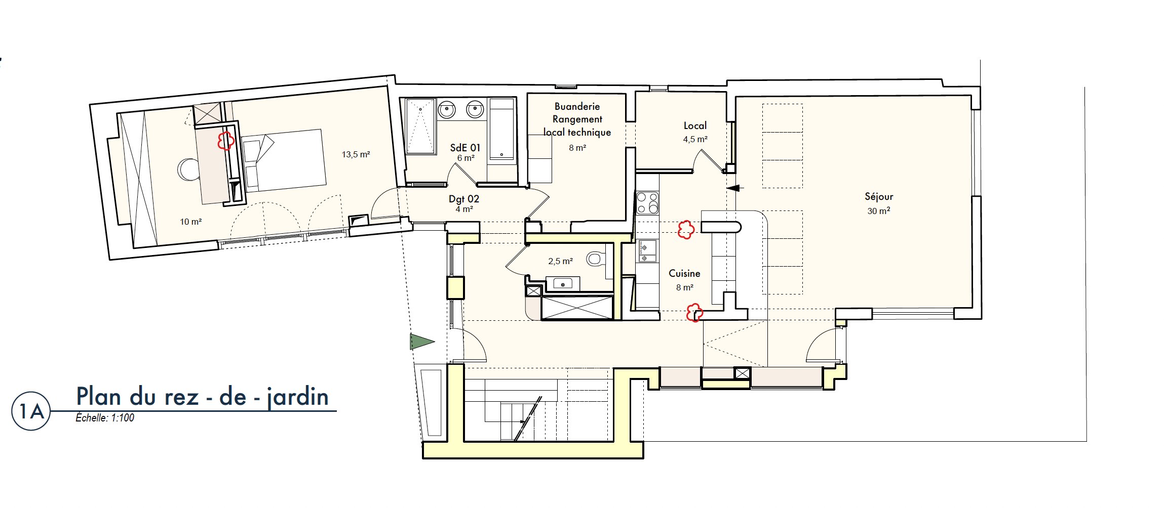 convert this floor plan into a architectural isometric 3d view of a full house show the space from an elevated angle with furniture walls and details visible plan vu de dessus maintien les meubles leurs emplacements sols en parquet chevrons use the same furniture as shows on the plan do not change the orientation of the floorplan