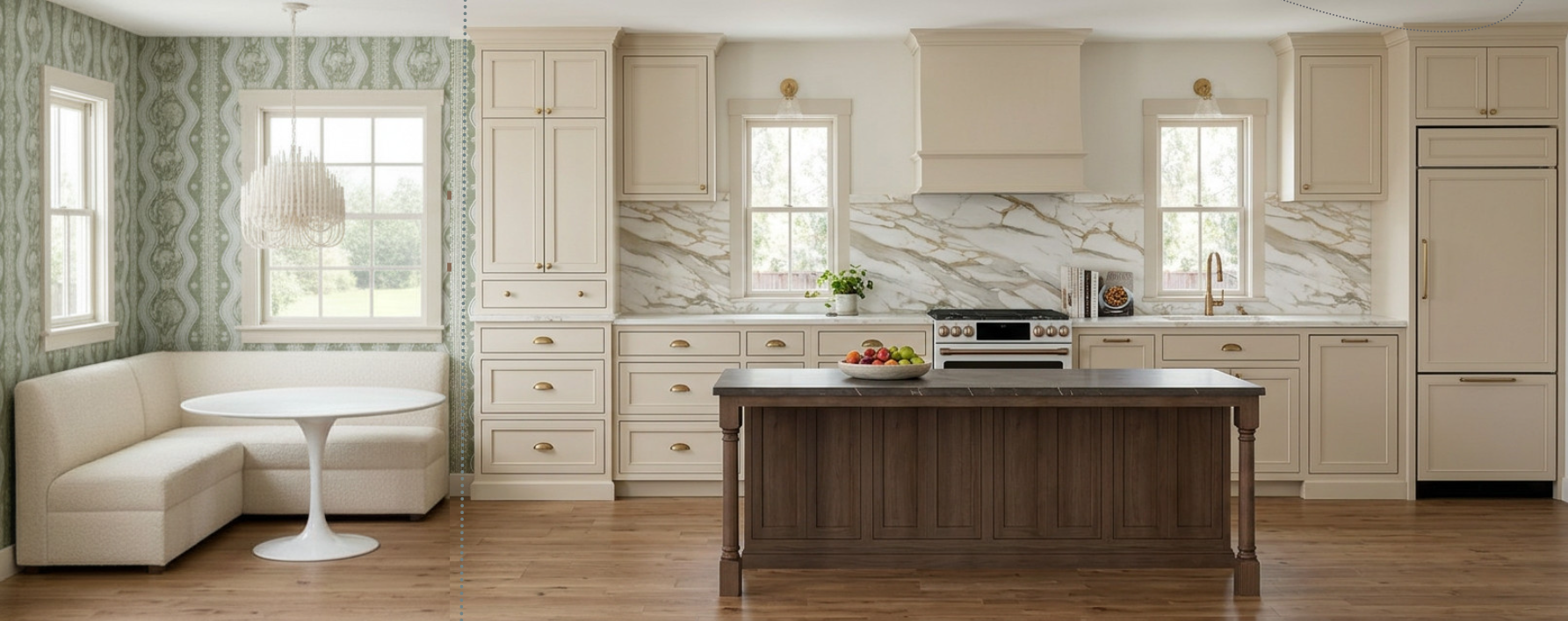 show this exact same rendering but the banquette only on the side facing the kitchen with two chairs under the window and the wall sconces coming out from sides of the upper cabinets not above the window