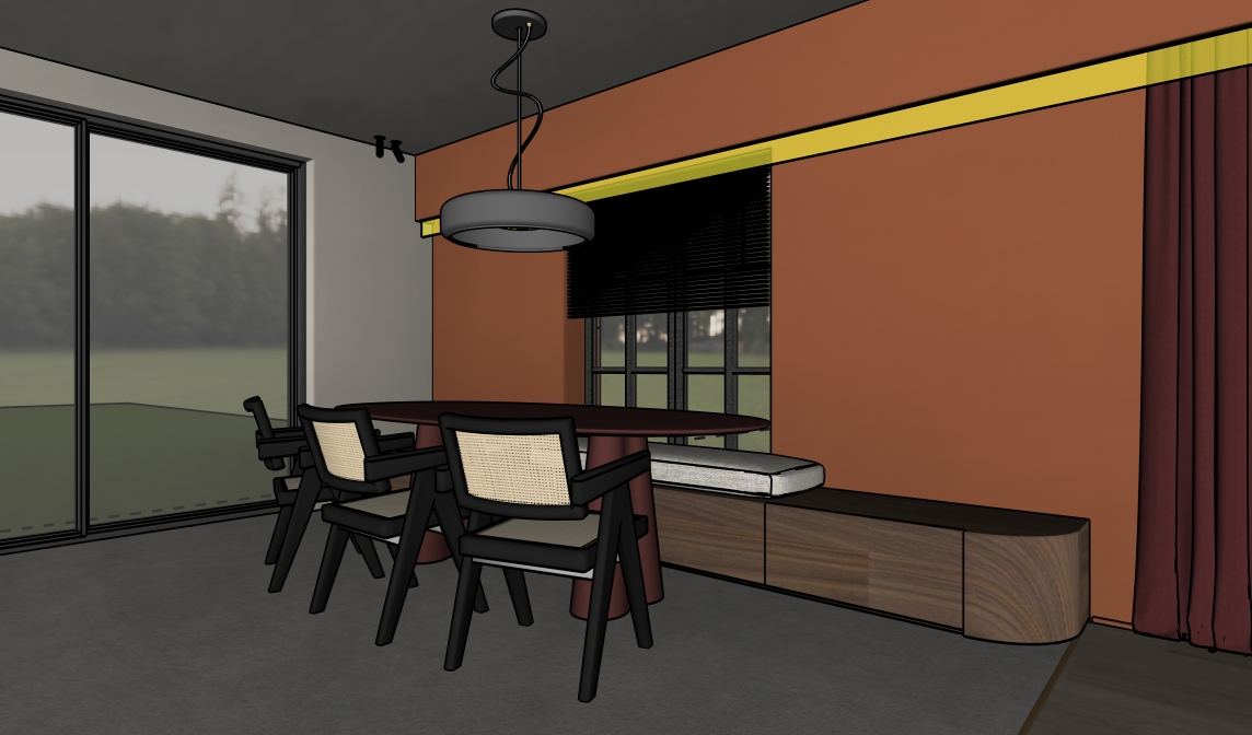 create an ultra high end extremely photorealistic architectural interior render in true 4k resolution strictly based on the uploaded reference image of the dining area the entire spatial layout dimensions proportions architectural structure built in elements furniture placement camera position viewing angle perspective and composition must remain 100 identical to the reference image no redesign reinterpretation relocation or simplification of any elements is allowed the reference image is absolutely leading architectural elements materials must remain exact walls warm terracotta wall exactly as in the reference smooth plaster finish all skirting boards painted in the exact same color as the wall they touch ceiling pure matte white ceiling window door frames slim black aluminum profiles identical dimensions and placement bench cabinet under the window built in low cabinet in walnut veneer horizontal grain matte finish visible joints between cabinet fronts seat cushion beige boucl fabric soft texture subtle textile relief top surface continuous wooden top matching the walnut veneer right window wall horizontal walnut wooden slats integrated at the window side identical tone to the cabinet led lighting the yellow strip in the reference must be executed as integrated warm led lighting soft indirect glow realistic diffusion no visible light source pendant lamp keep the exact model and position add a working internal light source with realistic warm illumination ceiling spots the two corner spots must emit realistic light beams with correct direction and falloff dining table chairs identical models proportions and placement as the reference curtains dark red burgundy fabric heavy textile appearance flooring parquet floor exactly as reference but rendered more detailed visible wood grain plank joints natural variation grey area becomes greige tiles 80 80 cm soft concrete look subtle texture and realistic joints transition profile between parquet and tiles in brushed copper finish thin and precise view exterior environment view through the sliding window shows a lush green garden natural vegetation realistic lawn and depth no oversaturated colors lighting critical natural daylight as the main light source soft sunlight entering from the left glazing realistic global illumination subtle soft shadows and correct contact shadows functional light in the pendant and both corner spots warm led accents integrated in the wall lighting quality comparable to professional architectural photography render material quality ultra photorealistic high end architectural visualization true 4k look extremely sharp zero blur full pbr material workflow correct roughness reflections and micro imperfections natural color balance and realistic exposure no cgi or plastic appearance camera photography exact same viewpoint as the reference image eye level interior shot full frame architectural photography look natural focal length 24 35 mm perfect verticals no lens distortion subtle depth of field realistic focus mood atmosphere warm refined and contemporary calm elegant residential dining space realistic lived in feeling without clutter negative prompt always include avoid cgi look illustration cartoon style stylized lighting harsh contrast sketch wrong colors wrong materials glossy plastics wrong scale warped perspective added furniture extra decor people mess noise blur soft focus flat lighting overexposure underexposure unrealistic reflections