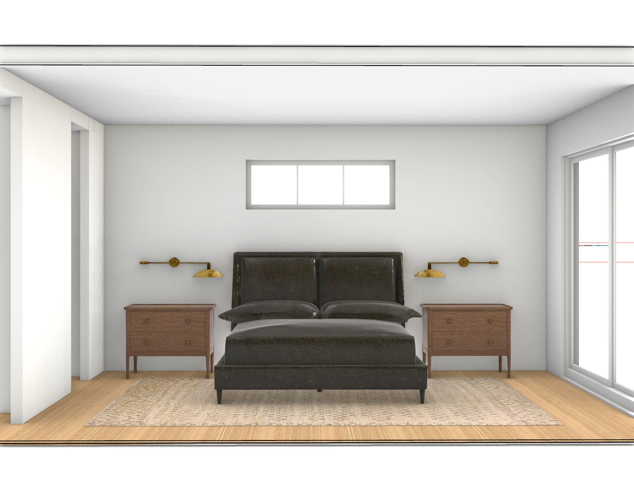 bedroom render enhance the texture and materials add soft light to the sconces and add cozy ivory bedding and pillows small patio outside sliding doors with palm trees add bathroom door same color as the walls add wood framed artwork to the wall next to bathroom door add some books accessories on the side tables