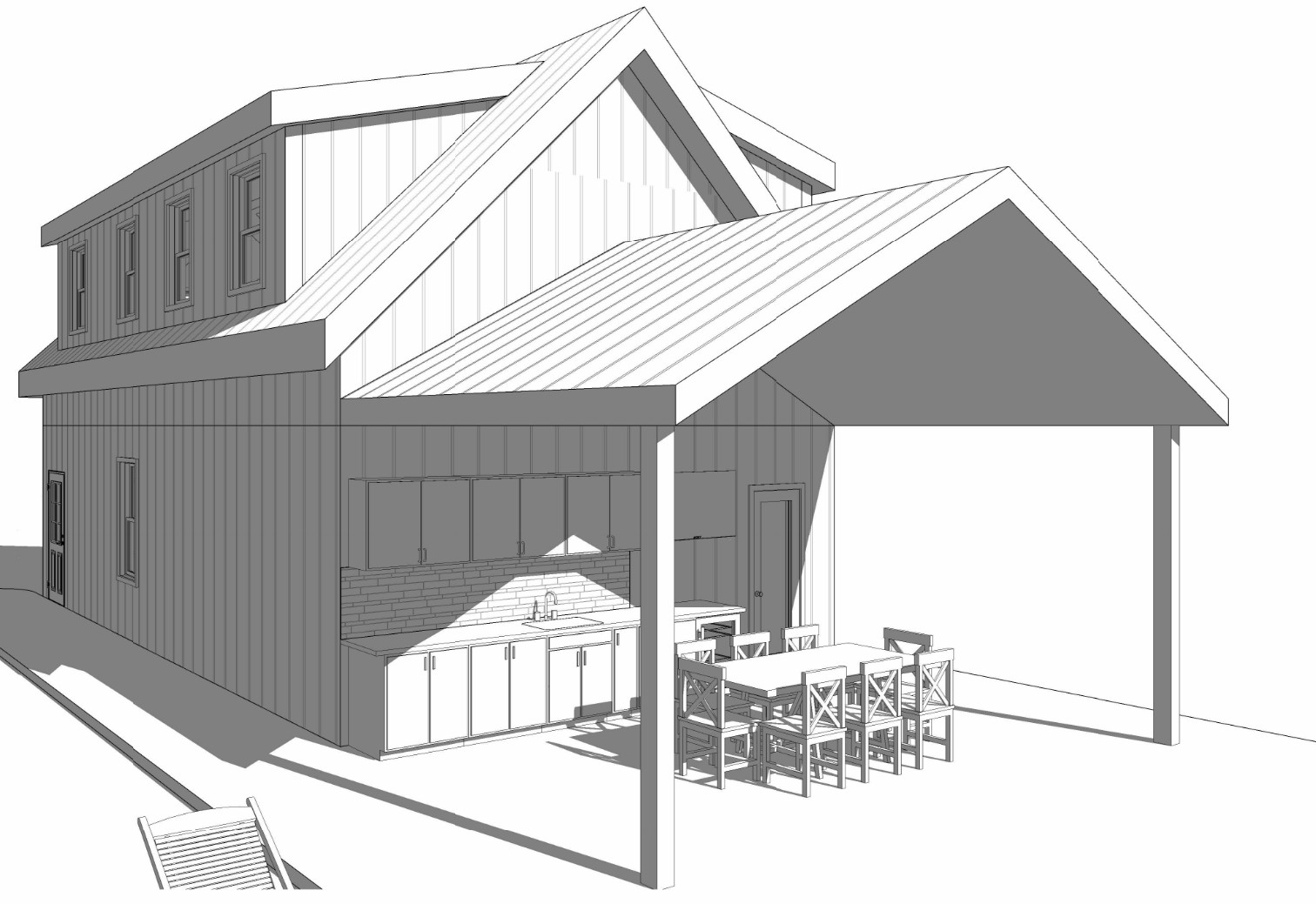 a detailed wide angle photograph of a custom modern farmhouse the exterior features crisp white vertical board and batten siding contrasted with black framed windows make sure to include the black framed windows also and a dark grey metal standing seam roof back porch that is covered kitchen area for outdoor cooking has posts and underside of roof crafted from warm cedar detailed with black iron strap kitchen cabinets to be a crisp very light grey tone and similar black iron hinges and handles countertop to be dark granite on wall above man door can be a modern black gooseneck barn light building is bordered by lush green landscaping hydrangeas and ornamental grasses the setting is golden hour with soft warm sunlight illuminating the facade against a backdrop of mature trees and a clear blue sky at front bottom of image is the hint of a pool with beautiful blue water glistening in the sun do not change any windows doors porches dormers overhangs roof locations and do not change the view make the image as hyperrealist as possible