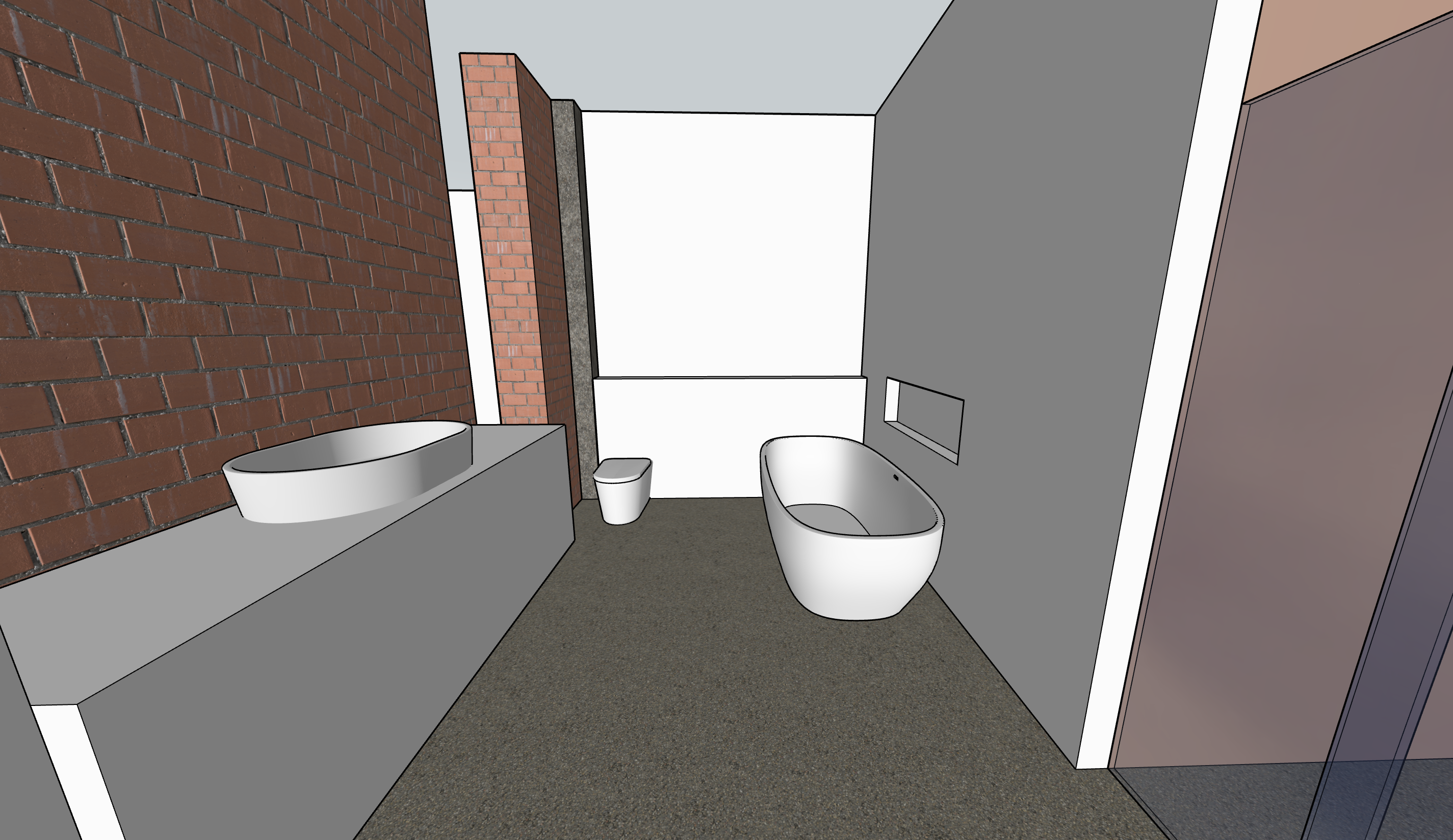 mediterranean revival interior shot add a few plants to the deisng the walls are a light limestone beige the floors a beige stone tile on the left add a mirror above the sink to the right where you see the glass panel is the entrance to the shower architecture