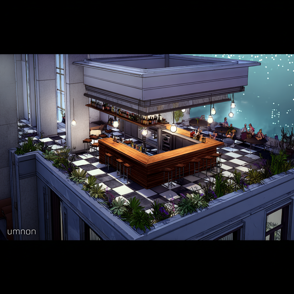 rooftop shot add a person staring at the picture wall