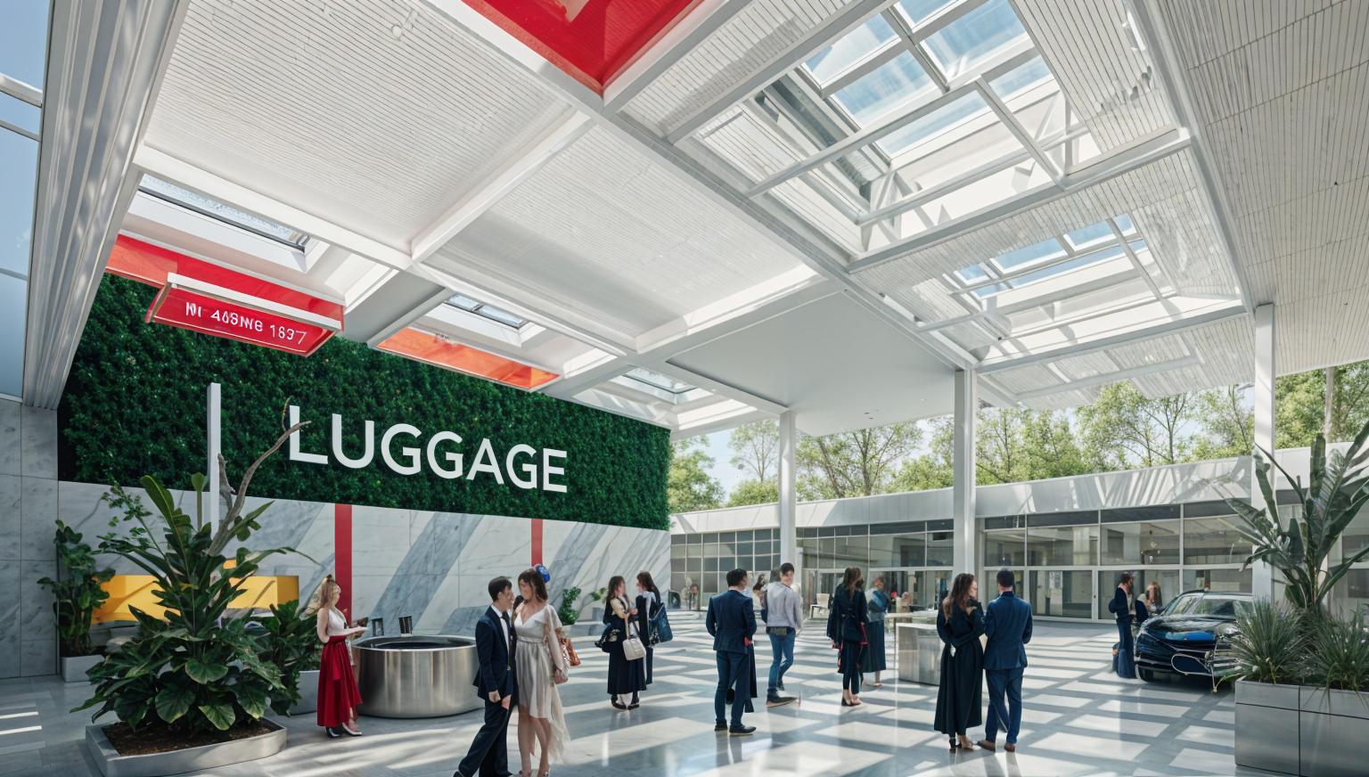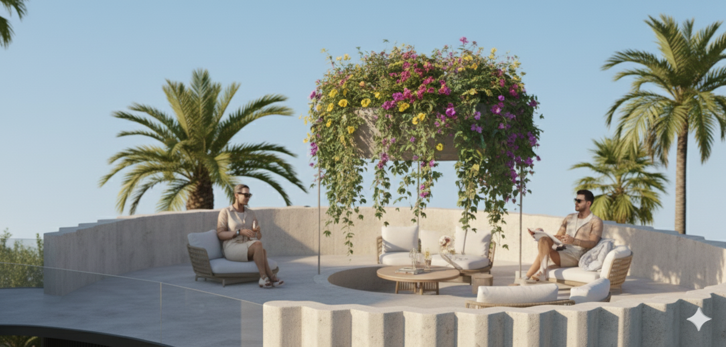 remove the table from the center and instead add glass as if its a skylight to the building undernearth keep everything else the same make the couple in love and intimate add more thhings to the rooftop in addition to whats already there maybe a gym section bring the glass under the plants back