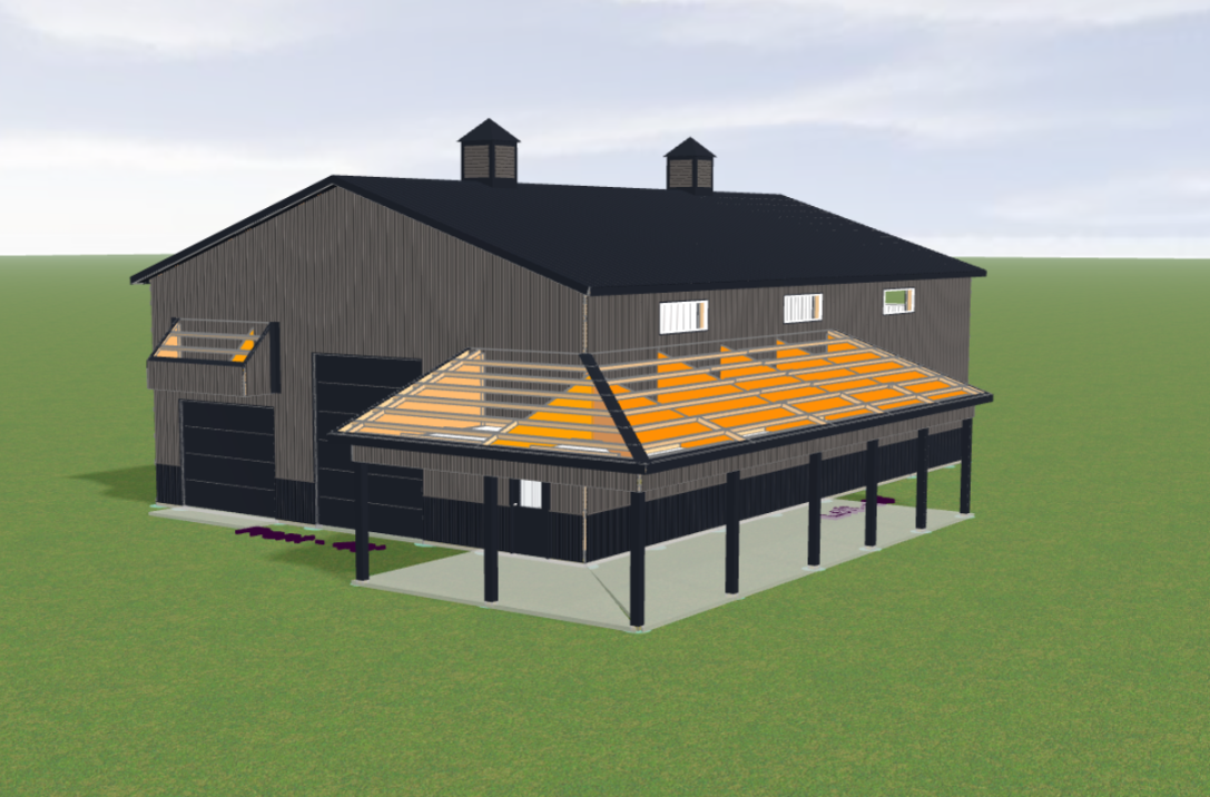 can you make this look more realistic add old galvanized steel to the porch roof and awning above the overhead door only all other colors to stay the same add some rural trees to the background and a concrete driveway to the overhead doors