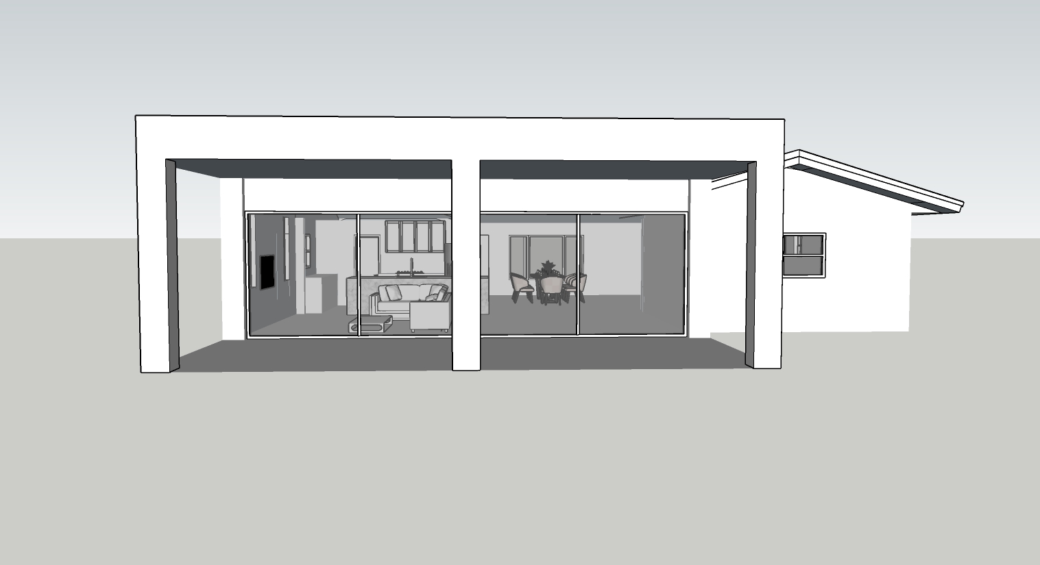 generate a realistic rendering of the exact same architectural scene shown in the uploaded image do not change any part of the structure layout furniture or materials the layout is as follows the living room is on the left the kitchen is directly behind the living room and the dining area is on the right there is a large sliding glass door across the entire front facade providing a full view into the living kitchen and dining areas generate a realistic rendering of the exact same architectural scene shown in the uploaded image keep the building structure dimensions materials furniture and interior layout completely unchanged add a tropical florida landscape in the background and surrounding area include elements such as palm trees lush green tropical plants a sunny blue sky with light clouds and a well maintained lawn ensure the lighting reflects a warm sunny florida day do not modify the house design or any of the architectural features white painted walls