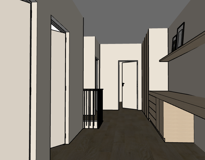 render a modern interior with a sleek staircase only where it is visible in the reference image there is no staircase on the left side of the scene do not add suggest or imply any stairs steps or railings on the left side feature light oak wood for the flooring and built in furniture use a soft warm white beige tone for the walls baseboards door frames and doors must be finished in the same warm beige tone as the walls creating a continuous monochromatic look do not introduce contrasting colors trims or finishes for these elements set the ceiling to a warm white do not add any extra frames shelves furniture or decorative elements beyond what is shown in the reference image lighting all natural light must come strictly from the camera viewpoint direction no light should enter from the right side or the left side as there are solid walls in those directions use soft diffused frontal daylight with realistic global illumination add a subtle warm glow coming from the floor lamp without overpowering the scene you may add a couple of recessed ceiling spotlights with warm light discreet and realistic style render in high end photorealistic quality with real world materials no sketch look no outlines no edge detection no toon shading preserve the original camera angle and composition ensuring a fully realistic appearance