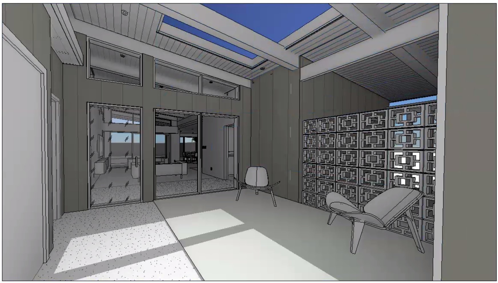 a relaxing japandi inspired modern exterior entry courtyard with a concrete walkway leading to the glass entry door that is separated to the left of the other 2 large glass panels with a turfed lounge area to the right in a mid century eichler designed suburban home with t g ceilings and exposed beams set in arizona with a breezeblock wall separating the courtyard from a carport out of view to the right of frame the main living area of the house is visible behind large windows in the mid range background with the backyard visible behind another wall of windows in the far background