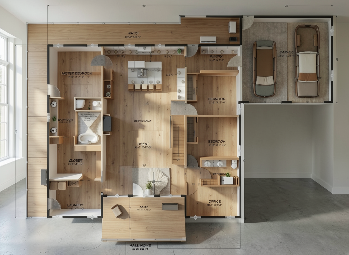 render a modern interior architectural space with high ceilings and large windows use soft beige for the walls and a warm light gray for the floor the window frames should be a sleek dark gray illuminate the scene with natural daylight streaming through the windows creating a bright and inviting atmosphere add subtle reflections to the glass and a hint of greenery outside enhancing the serene and open feeling of the space make the rendering look more realistic rather than a 3d model do not change any geometry in the model keep all geometry the same add a large hanging fixture in the center of the room similar to the one in the reference images