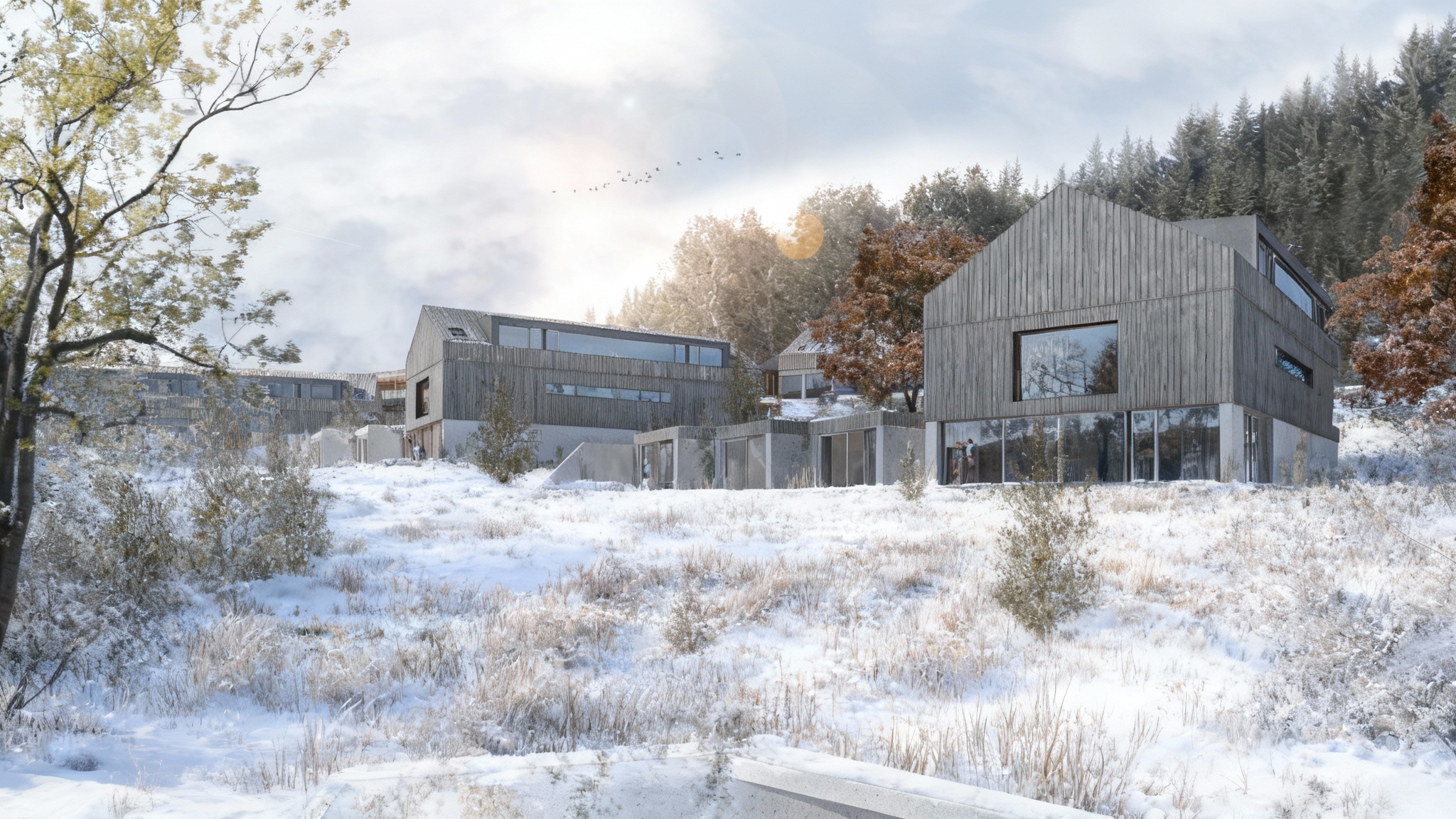 overall more precise and realistic visualization wood on the facade more gray clouds winter light through the clouds realistic glass reflections winter landscape and grasses