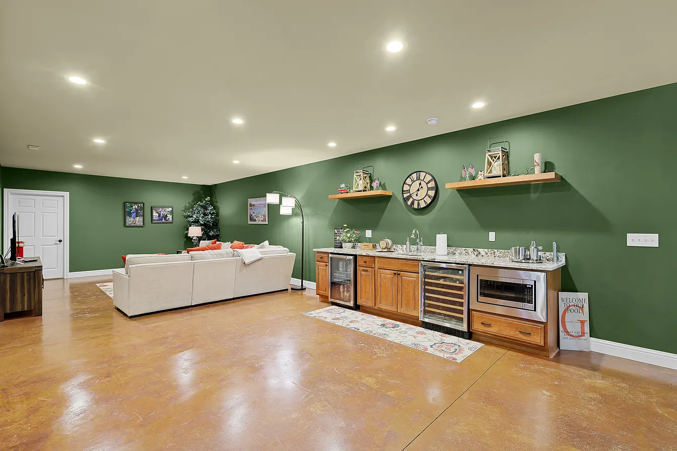 add an island of cabintry in a black finish directly in front of the exisiting cabinetry keep counterop finish the same add seating on the backside