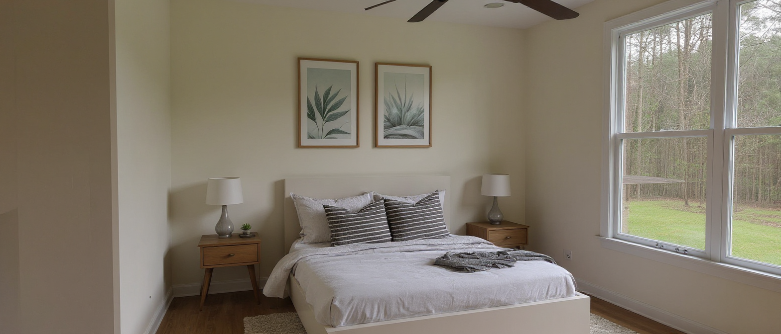 sherwin williams alabaster wall paint add decor add artwork above bed wooded lot outside of window make wall behind bed sherwin williams cocoon trim and doors are white