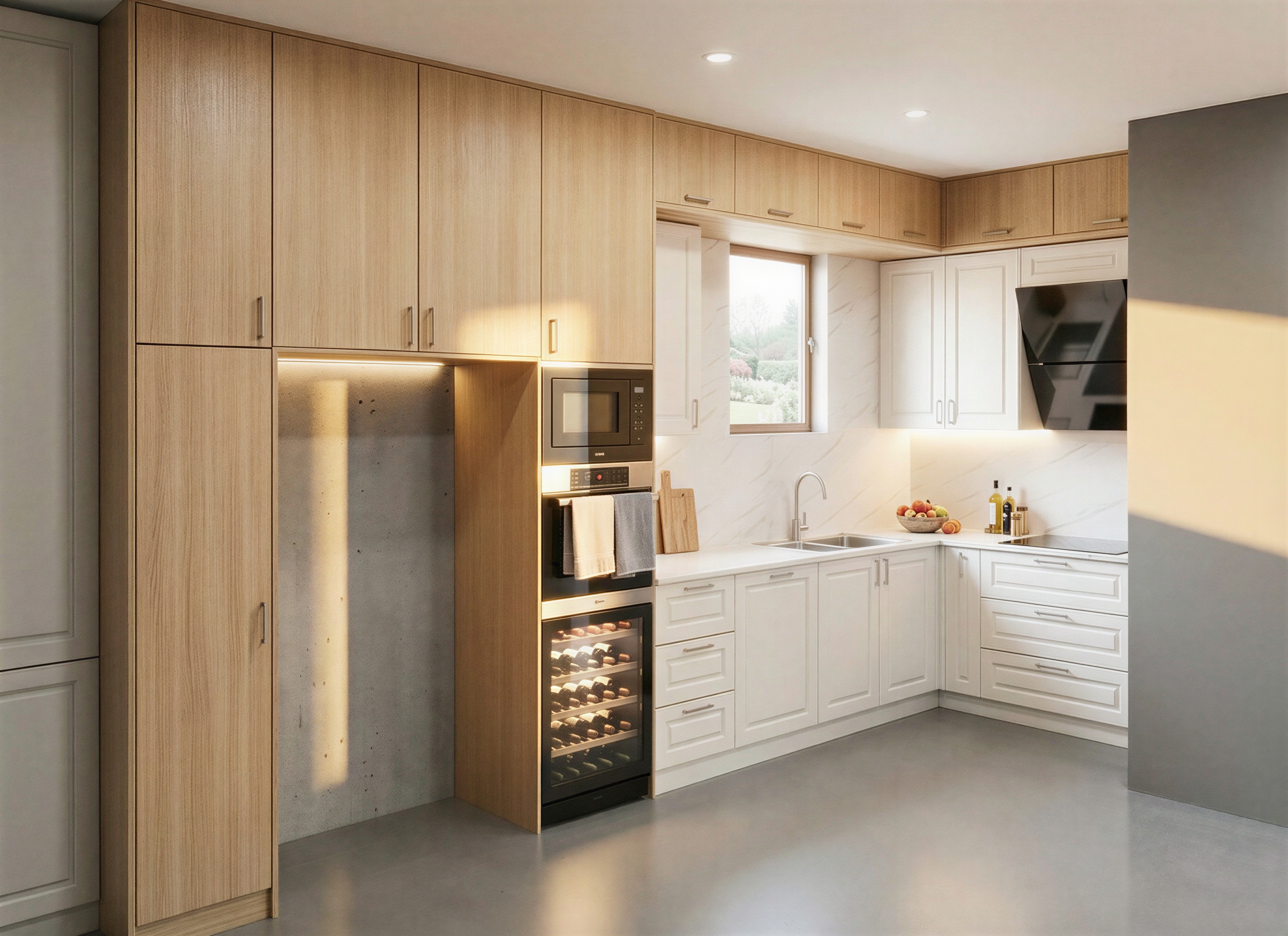 interior description the nocturnal sanctuary as the sun sets the kitchen undergoes a dramatic transformation the bright airy japandi space shifts into a low key atmospheric lounge where light is used sparingly to define shapes rather than flood them the play of artificial light the primary source of light is no longer the window but the warm led strips tucked beneath the upper cabinets this creates a wash of light over the marble backsplash making the grey veins pop against the white stone the light spills onto the countertop casting long soft shadows behind the fruit bowl and the olive oil bottles giving the workspace a sense of depth and mystery the glowing heart the wine cooler becomes the visual anchor of the room its internal amber glow radiates through the glass illuminating the labels of the bottles and casting a warm inviting pool of light onto the polished concrete floor next to it the digital displays of the oven and microwave provide sharp clinical points of blue or white light tiny beacons that cut through the darkness of the wooden monolith the mirror effect the window which previously showed a garden is now a dark reflective void it acts as a mirror showing a ghostly distorted reflection of the illuminated kitchen interior this double image adds an extra layer of complexity to the room s geometry adding the note of realism night edition to make this nighttime render feel like a real photograph we need to capture the quiet imperfect breathing of a house at night 1 the digital glow and light leak in a real photo the light from the oven s digital clock wouldn t just stay on the screen it would cast a faint colored tint on the nearby wooden cabinet edge you would also see a tiny starburst effect or lens flare where the led lights are most intense a common artifact of nighttime photography 2 the hidden textures under the harsh directional light of the leds textures become more aggressive the micro scratches on the marble or the slight dust on the top of the wine fridge which is invisible during the day would catch the light and become subtly visible the concrete floor would show its sheen more clearly reflecting the under cabinet lights like a dark still lake 3 sensory silence realism at night is about what you don t see but can feel the sound the rhythmic almost imperceptible hum of the wine fridge cooling down or the occasional click of a cabinet door settling the lived in detail a single half empty wine glass resting on the marble counter its base catching a glint of light the silent evidence of a late night conversation the temperature the air would feel cooler and the contrast between the warm wood and the cold concrete floor would be more mentally palpable 4 technical noise a real nighttime photo isn t perfectly clean there would be a slight grain or noise in the darkest shadows of the concrete niche where the camera struggles to find light this tiny bit of visual grit is exactly what s missing from a too perfect 3d render