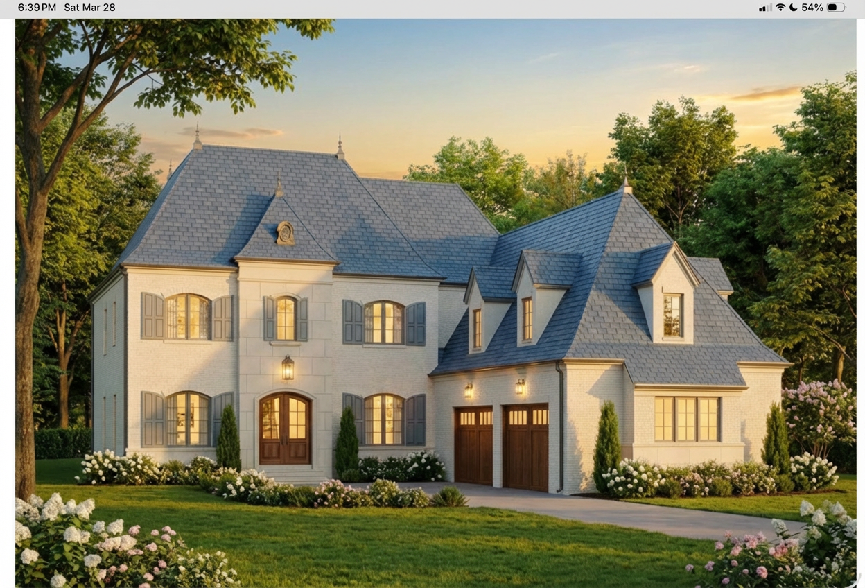 art deco exterior shot render a modern suburban house with a bright and inviting atmosphere the house has a classic design with three gables and a two car garage the exterior walls are color and pattern blocked with light and dark colored hardie the roof is a sleek dark charcoal gray black windows with grids do not use brick any where on the house the front steps and entryway are made of light gray stone surround the house with lush green grass and tall casting soft shadows the sky is clear with a gradient from azure to soft pink as if it s early evening no trees architecture