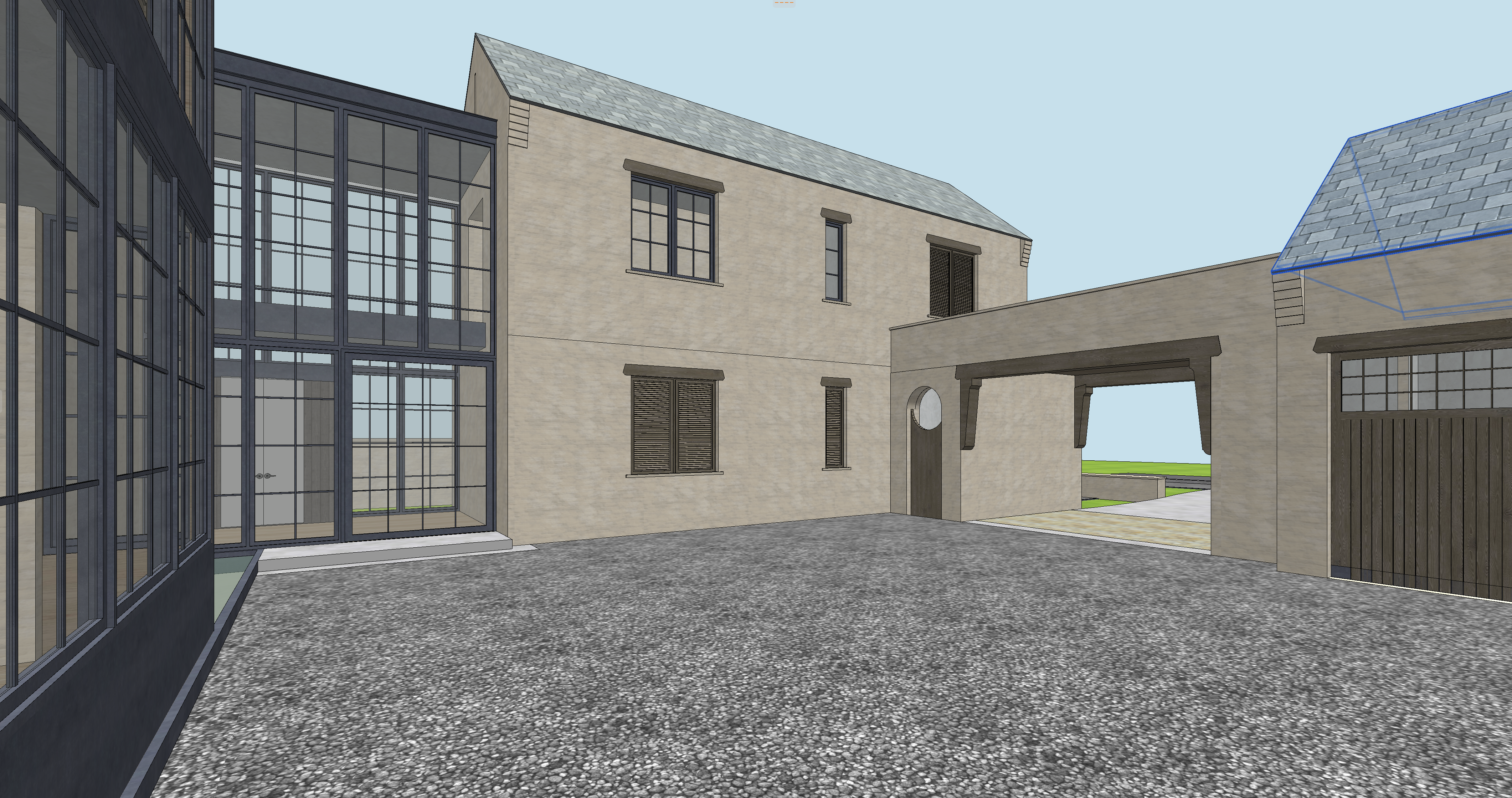 please render this to look hyper realistic the primary material is to be a tan limewashed brick roof to be slate tiles add trees in the background