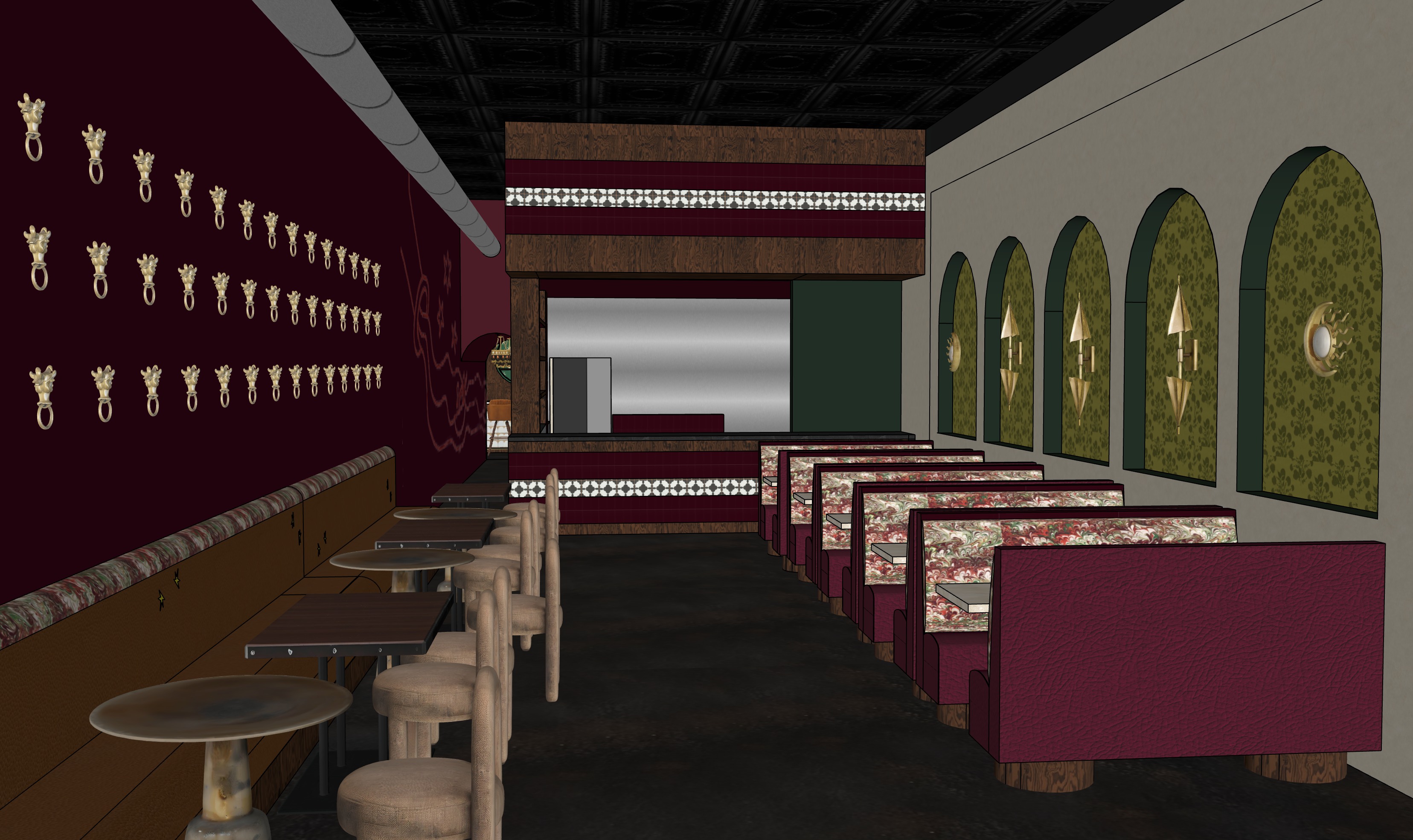 left wall is a textured burgundy berry textured paint there is sunlight illuminating the space the arches are not windows they have wallpaper and sconces the kitchen is stainless steel