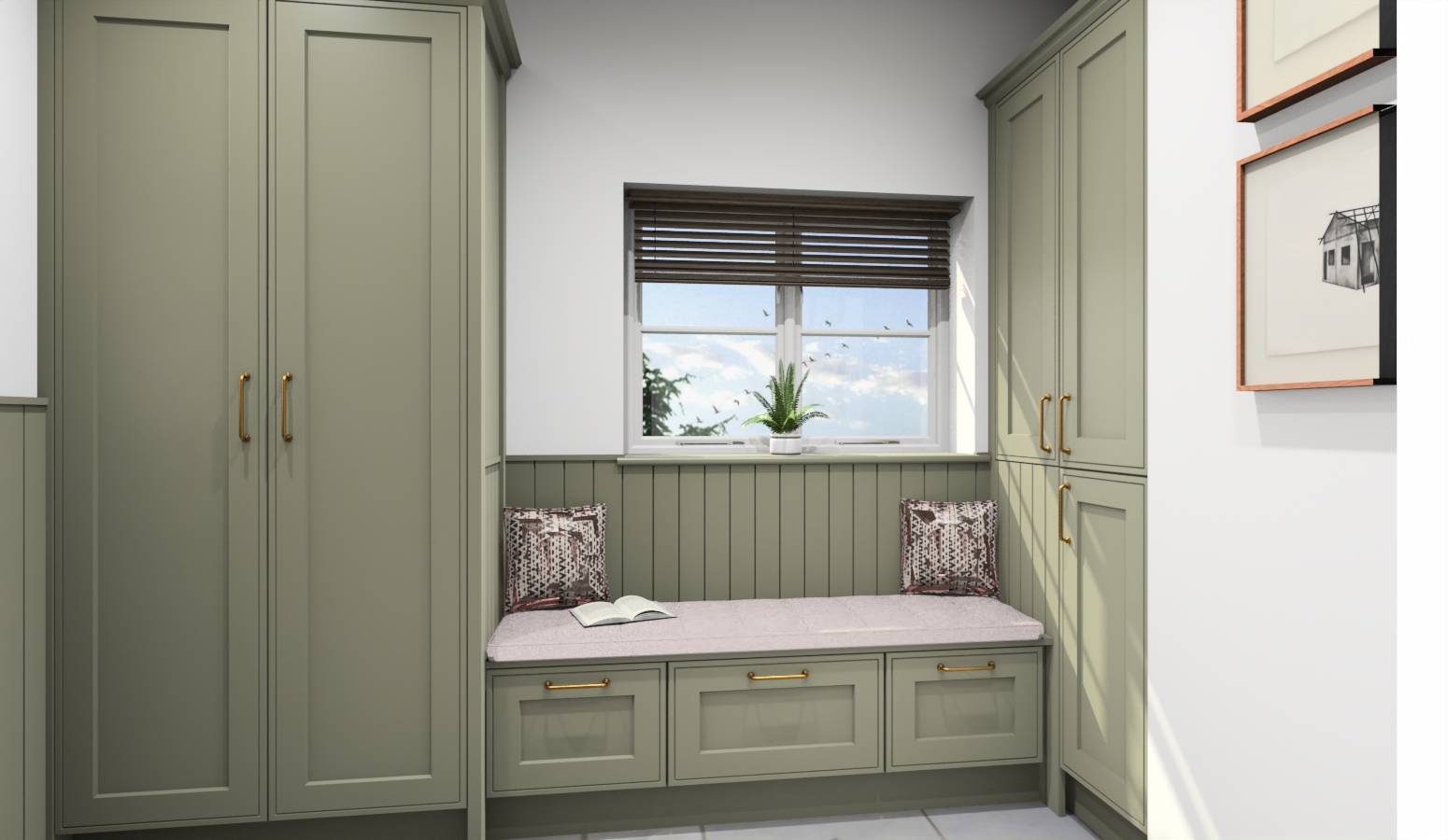 render a cozy and inviting hallway with elegant built in cabinets and a bench the cabinets and bench should be a muted sage green with gold handles the walls are a soft white creating a bright and clean atmosphere add two patterned cushions with burgundy accents on the bench place a small green potted plant on the window sill the window blinds are deep brown filtering warm natural light into the space and reveal a bright blue sky with soft fluffy clouds capture a calm and welcoming ambiance