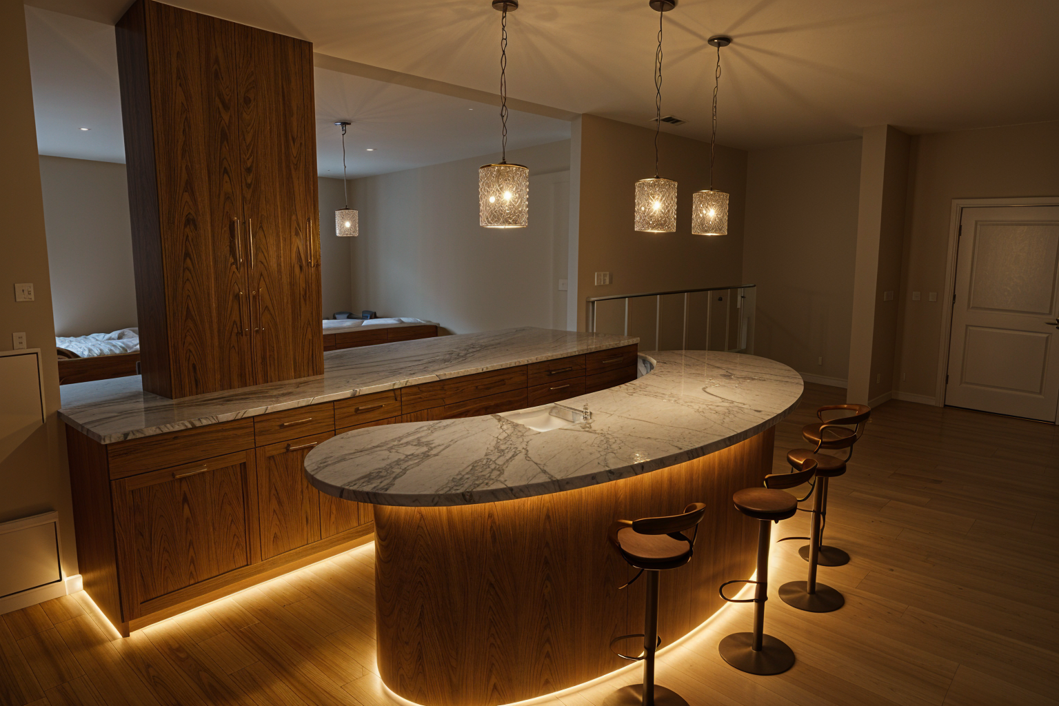 soft yellow led strip lights under the bar dont add anything else to it just make it realistic its white wainscotting on the sides of the wall not pipes