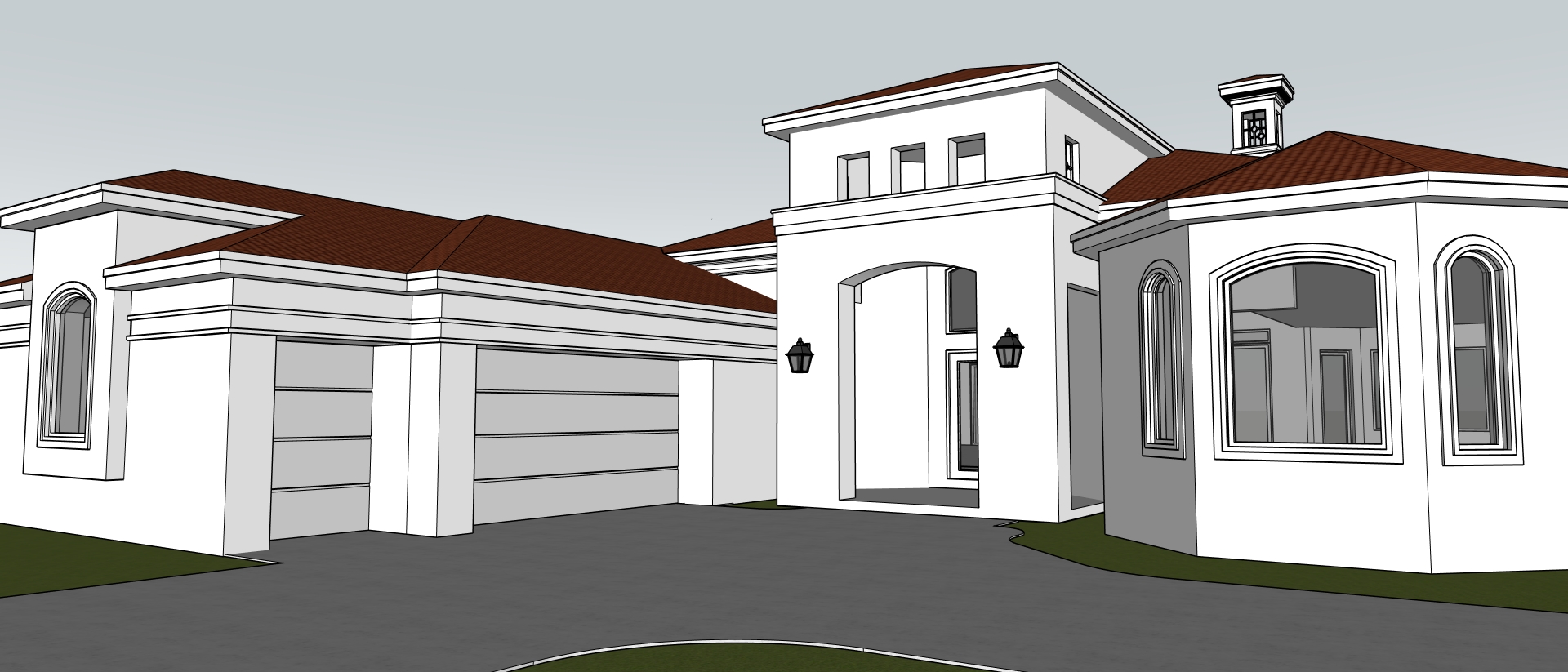 copy prompt photo realistic high quality image of a white house smooth stucco barrel tile roof in dark gray beautiful landscape keep structure and proportion intact