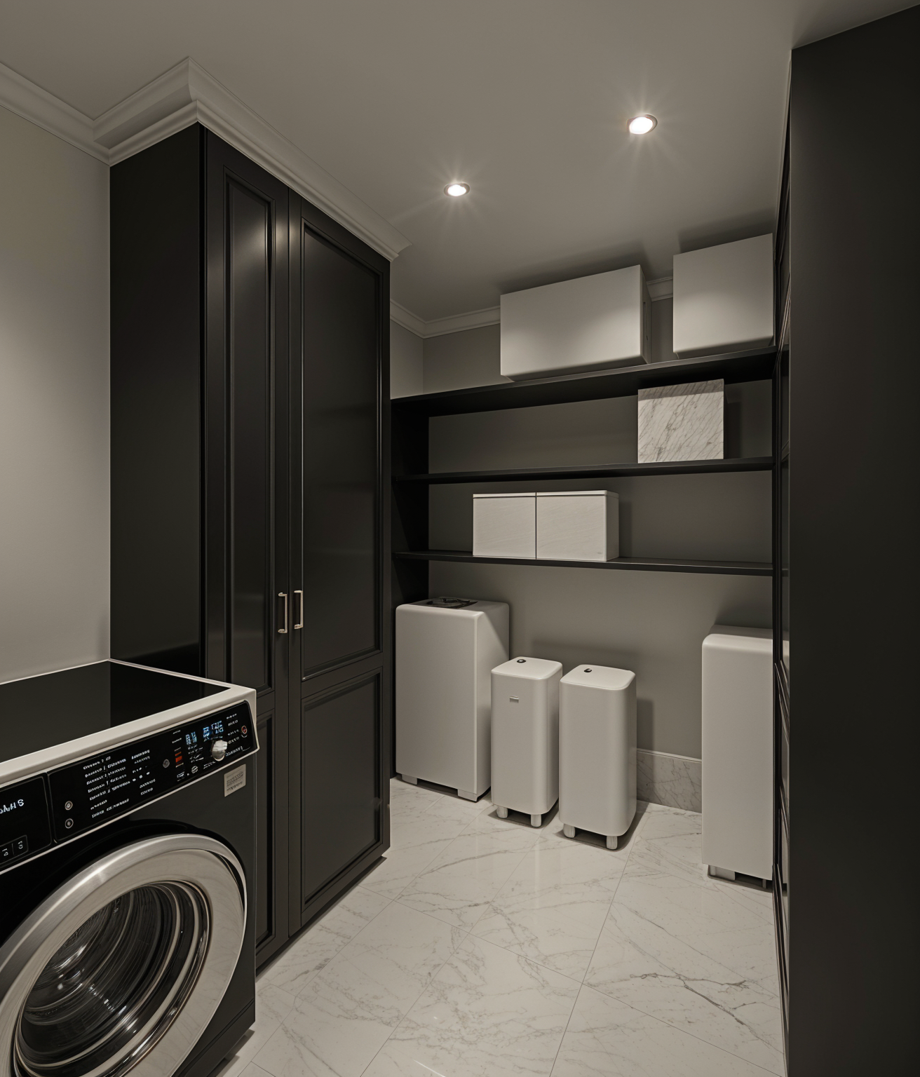 add modern furnitures with brown leather sofa and white lounge chair and big modern painting on the wall change base cabinets into a dining table