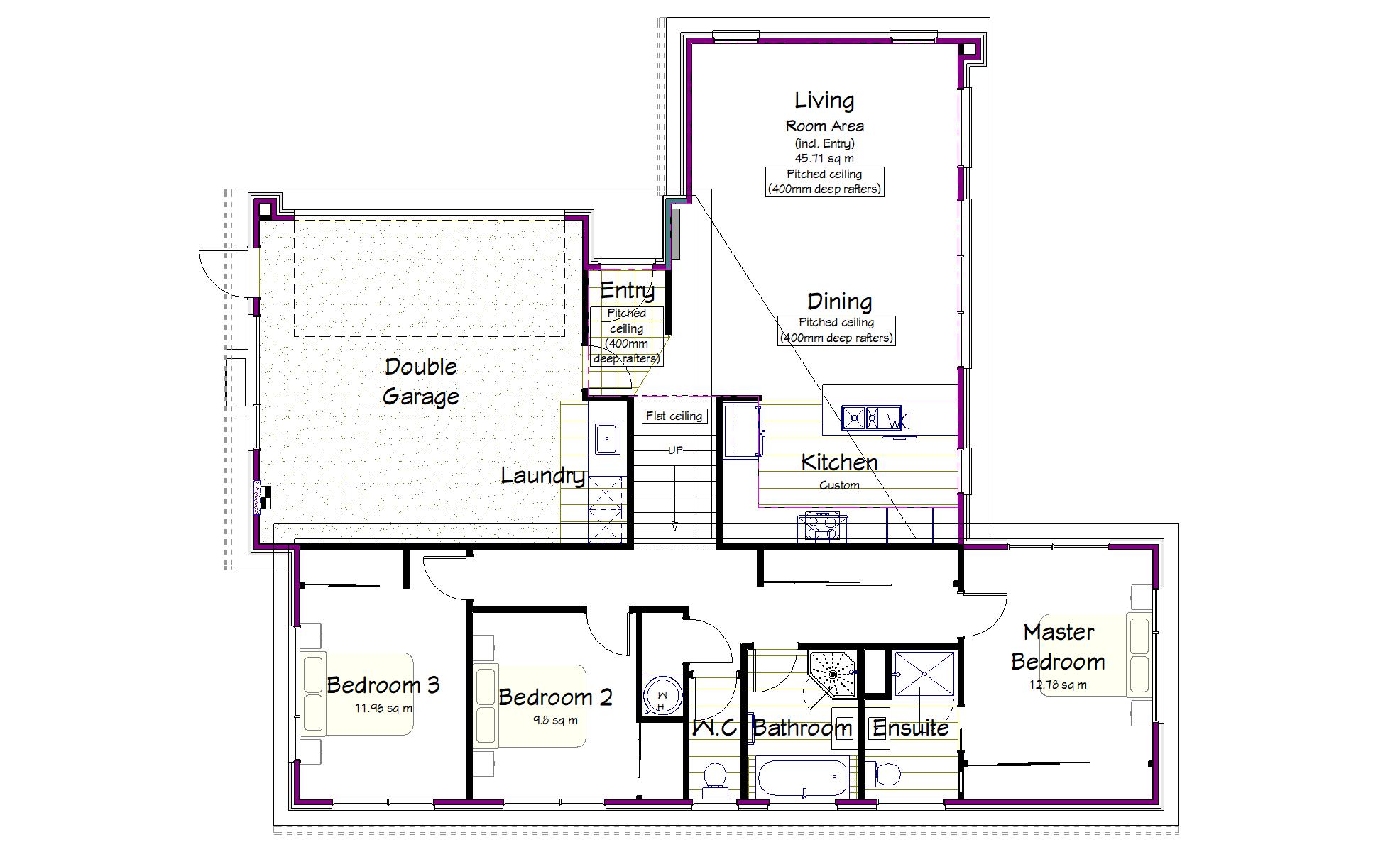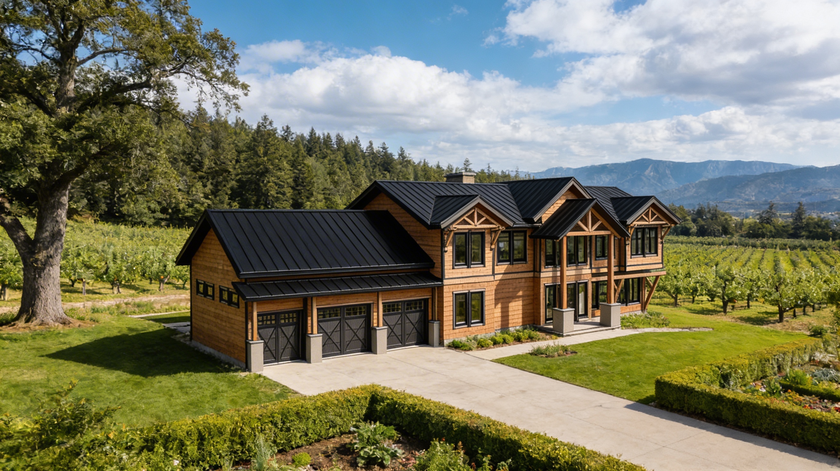 make this into a 3d render white bricks grey wood style with a driveway and fencing short grass some plants