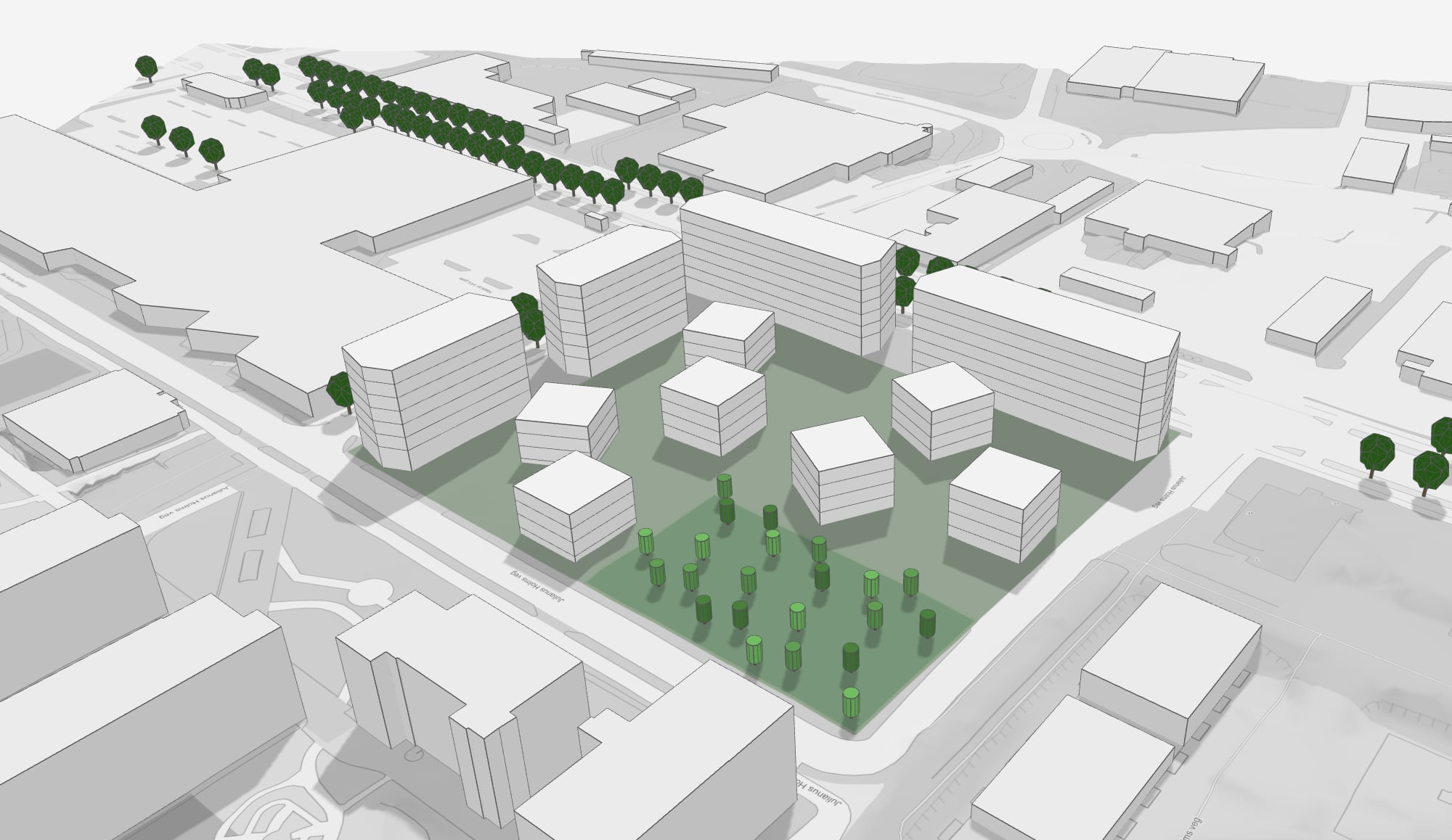 nordic rooftop shot create a photorealistic exterior visualization of a norwegian residential development focus on the buildings located within the green marked area in the model our design the buildings should appear as modern norwegian apartment blocks and townhouses using materials typical for norway light brick wood cladding and sections of glass roofs should be flat with green or dark surfaces facades should emphasize durability and a nordic aesthetic with clean lines generous balconies and large glass openings for natural light the outdoor area should be landscaped with a mix of grass lawns native trees and small pathways that connect the buildings include planted trees where shown in the model and add realistic greenery around the shared courtyard to create a welcoming communal atmosphere lighting natural daylight soft overcast sky typical of norwegian conditions shot type exterior shot slightly elevated wide angle to capture both the perimeter blocks and the smaller infill buildings in the center style modern nordic minimalism photorealistic rendering architecture