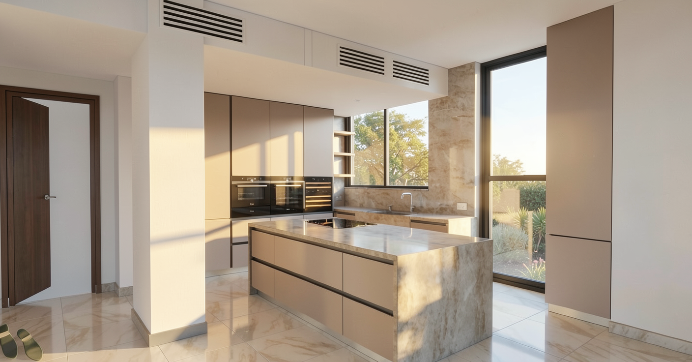 travaille comme si tu tais un professionnel dans la r alisation de rendu 3d pour des projets d architecture sans rien changer aux l ments pr sents sur l image de base rends le visuel de la nouvelle construction plus r aliste et ajoutes y une femme brune avec un cocker enfin adapte le grain et la lumi re de l image pour qu elle soit plus cin matographique change le rendu de la fa ade brique pour que la trame n est pas si r p titif fais des graviers au sol rajoute de l herbe sur le surfaces pelouse mais pas sur les surfaces graviers