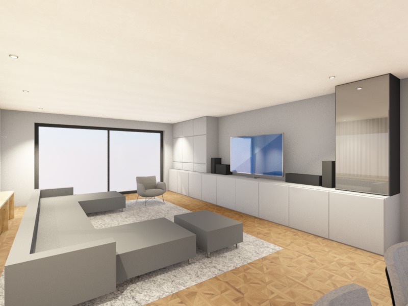put terrasse and garden outside of big window put light inside the vitrine display cabinet on the right side and place lego cars and buildings inside