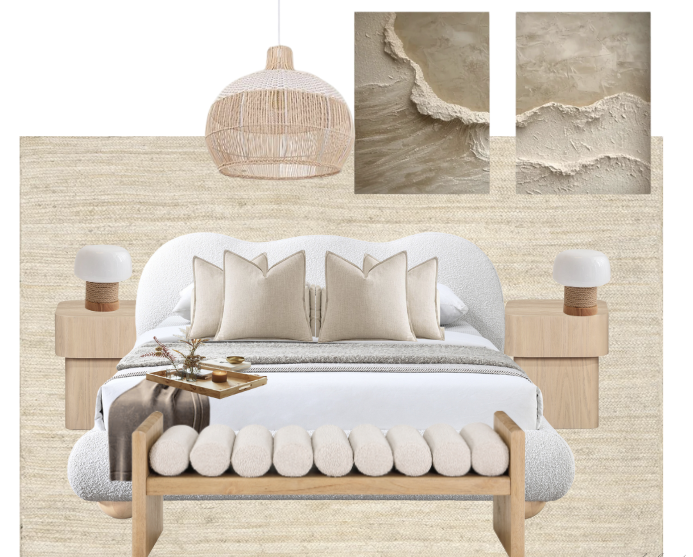 modern minimalist bedroom with a cozy tranquil atmosphere the bed is adorned with plush white bedding and four soft beige throw pillows a textured light brown throw blanket is elegantly draped across the end of the bed the bedframe and matching side tables are made of light oak wood creating a warm inviting feel a stylish rattan pendant light hangs from the ceiling casting a gentle natural glow the window is on the left and the exterior is a intracoastal view the art and furniture needs to be the same as the moodboard