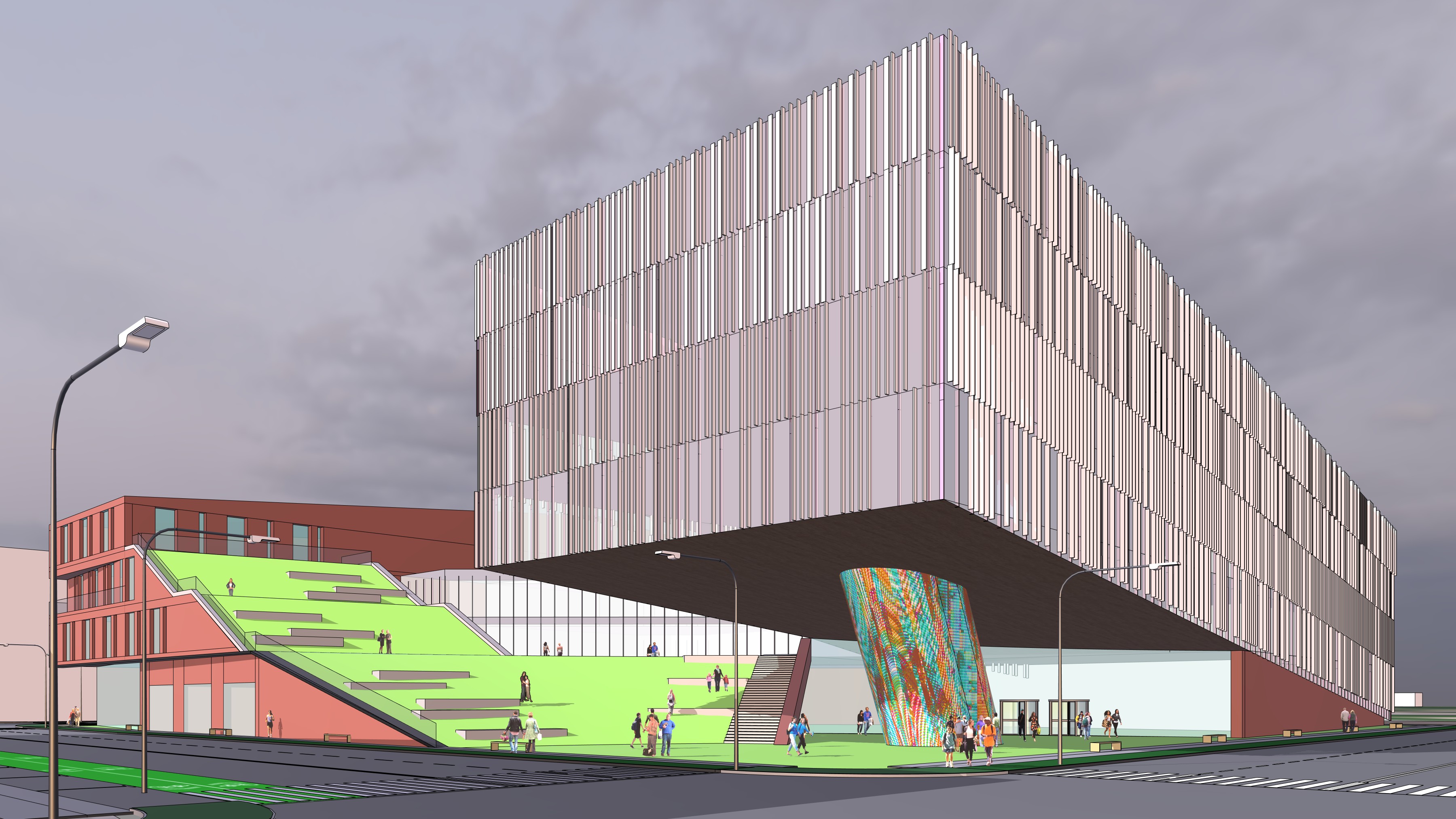 exterior shot modern architectural building with a futuristic design featuring a prominent overhanging structure with horizontal stainless steel panels the lower section has a vibrant gradient of geometric patterns in rainbow colors the adjacent building is a muted red the ascending stairs are a bright lime green creating a fresh contrast the sky is overcast with soft gray clouds evoking a calm introspective atmosphere the scene is populated with small human figures providing a sense of scale and community while maintaining an overall lively urban environment