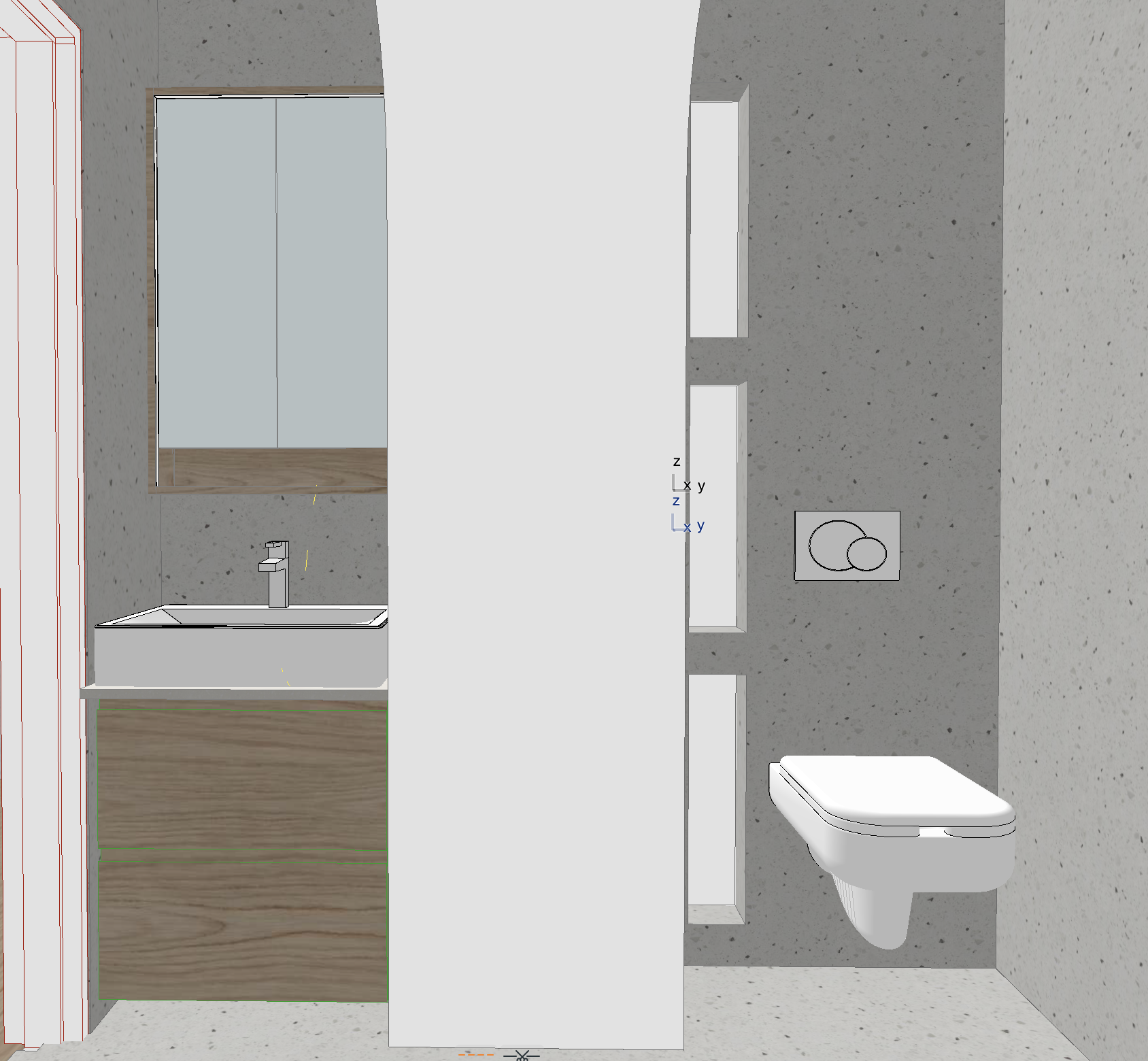 render a modern bathroom in elegant detail the room features sleek concrete walls in a soft neutral gray a floating wooden vanity in rich walnut brown with a glossy white sink on top the mirror above has a thin walnut brown frame for a cohesive look a minimalist wall mounted toilet with a pristine white finish adds a contemporary flair the atmosphere is calm and sophisticated with ample natural light softening the space include subtle accents of silver for the faucet and fixtures to add a touch of elegance