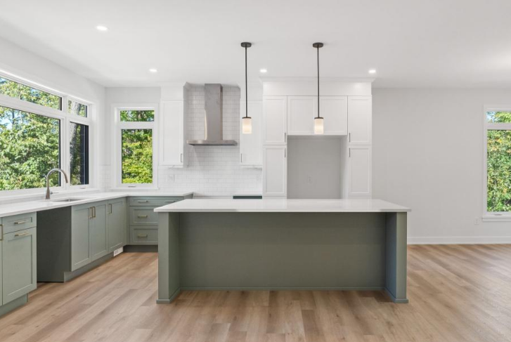 enhance this kitchen design and add modern farmhouse staging and ge cafe appliances turn all green cabinets to walnut wood and add a desk area to the right wall beside the fridge make the hood facade a decorative warm white flat panel hood