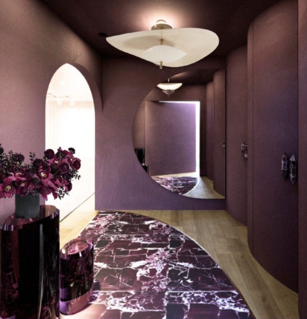 render this at 8k resolution and make it look more realistic do not change the design the light on the ceiling is a ceramic piece by artist elsa foulon render the marble on the floor so that it is a dark calacatta viola without white in it