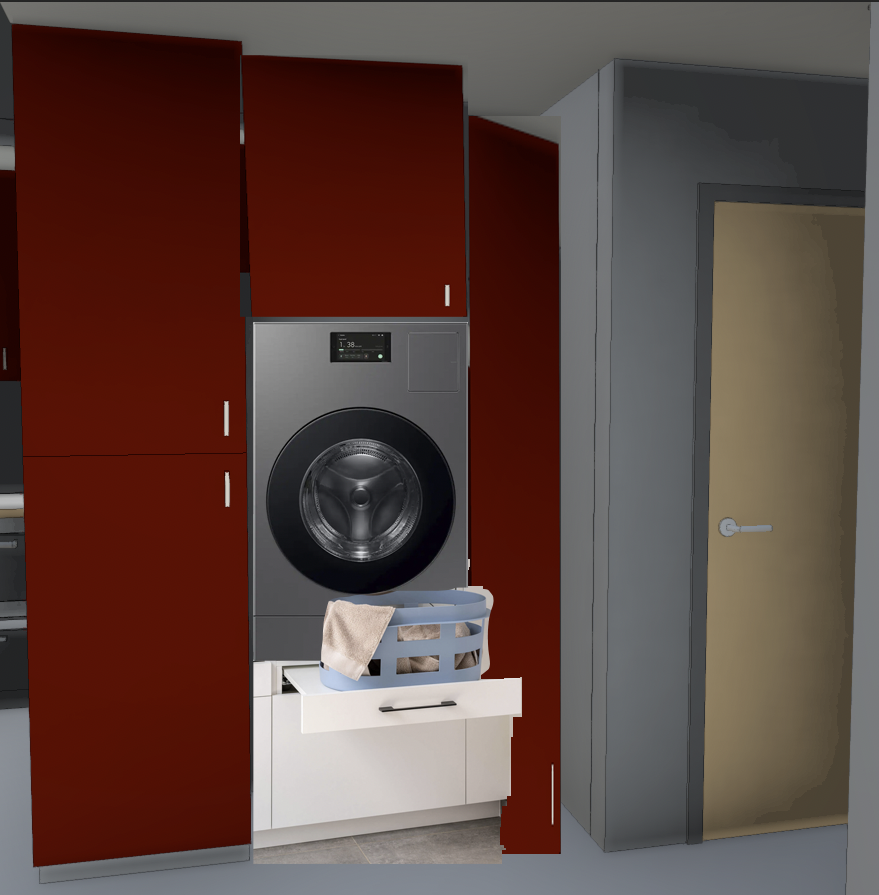interior shot render this with weathered grey cabinets and door think scandinavian organic modern style in the empty space add in more built in cabinets with a front load washing machine in the center with cabinets above and below it architecture
