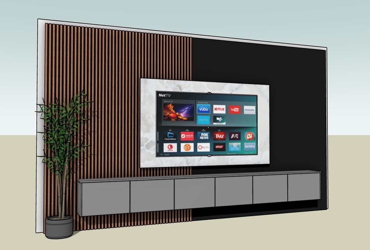 this is a tv unit with acoustice panels with led lighing around the acoustice panels the acoustic panels are an oiled oak colour the rest is a medium grey colour