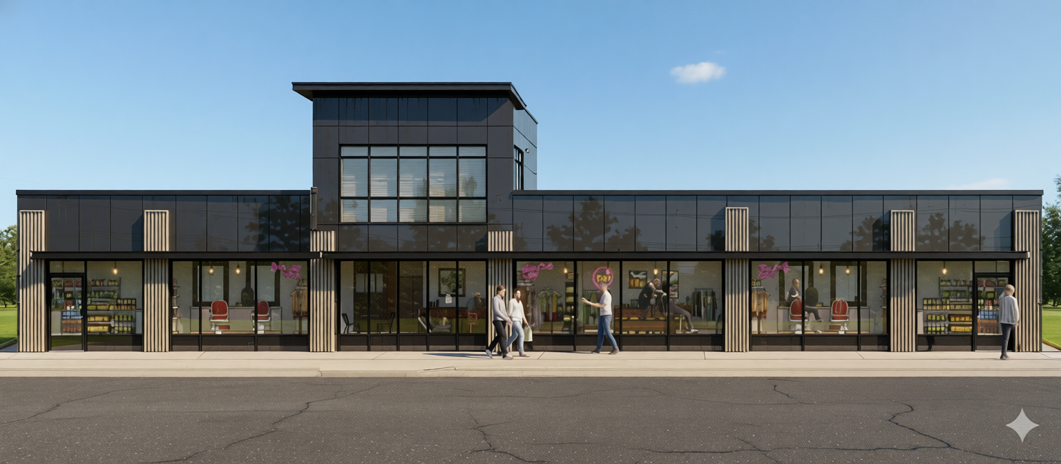 don t change anything about the exterior of the house leave the materials colors everything the same in the background include a back yard that s tucked into a woods trees around the house some smaller trees in the front with bushes and flowers black standing seam roof grey architectural steel siding with masonry on the front of the house rustic alder porch beams add some lounging chairs on the front porch and a stone walkway to the front door add an asphalt driveway in front of the two garage doors put a white pickup truck in front of one of the garage doors 8k ultra realistic rendering with the sun shining