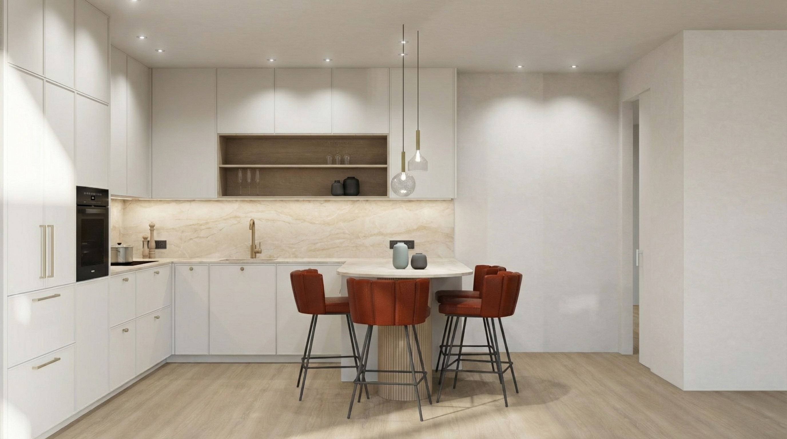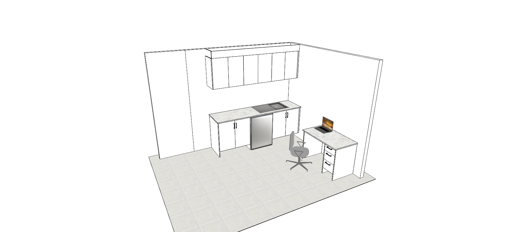 flat white cupboard panels under the bench is a bar fridge