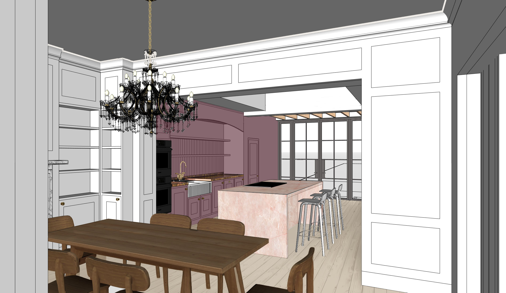 keep true to original image proportions and maintain all colours and finishes but add dappled summer sunlight and lawned garden beyond glass doors
