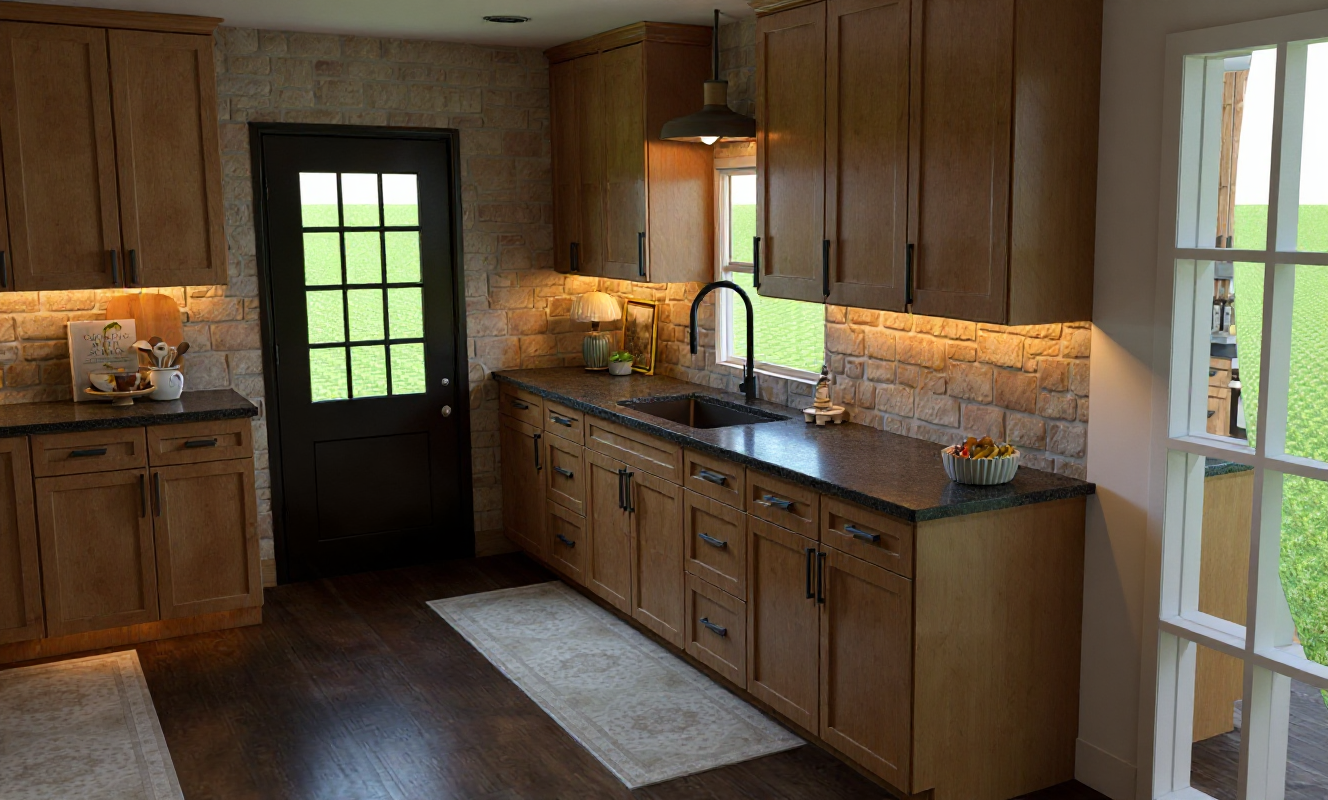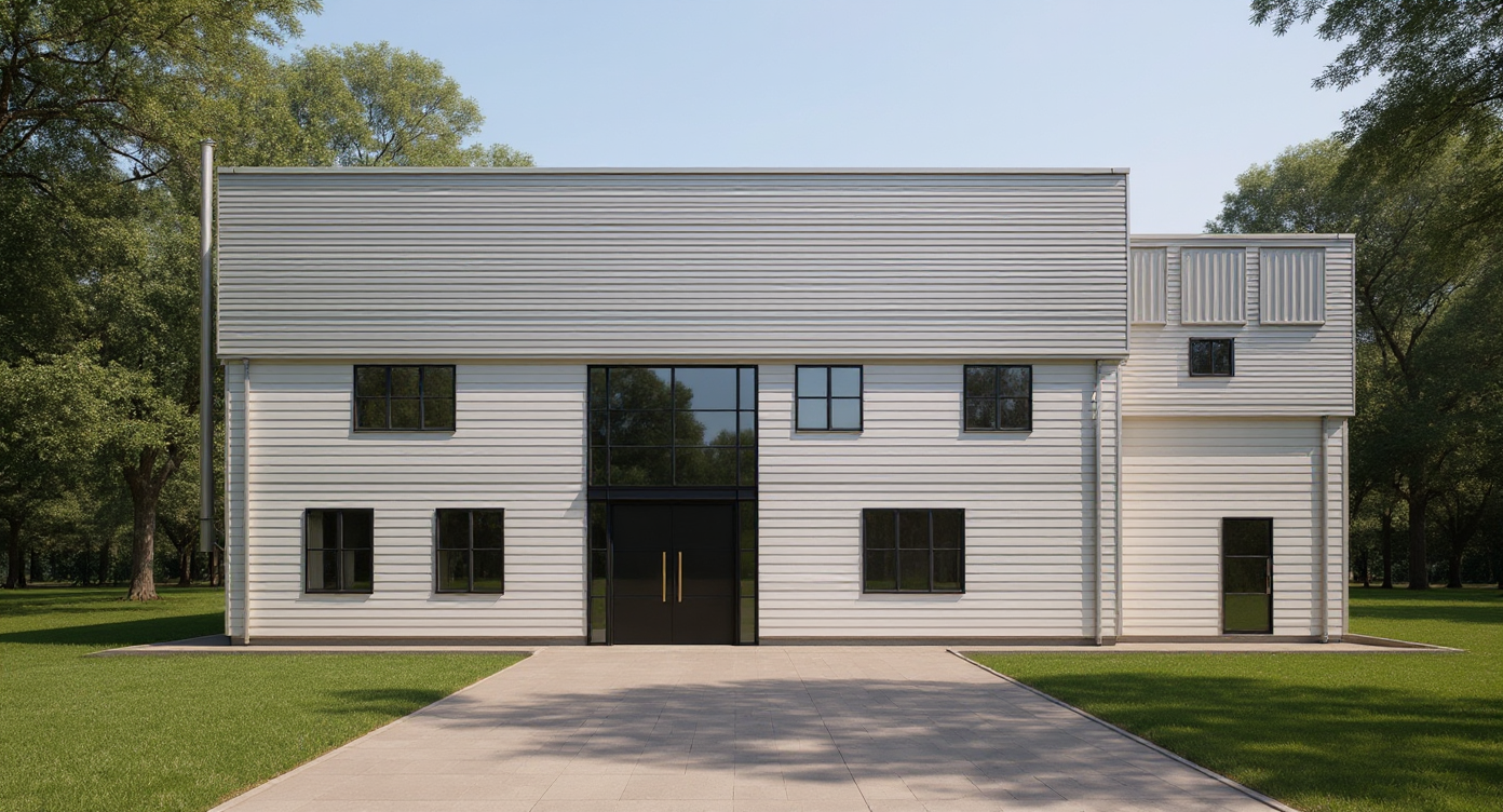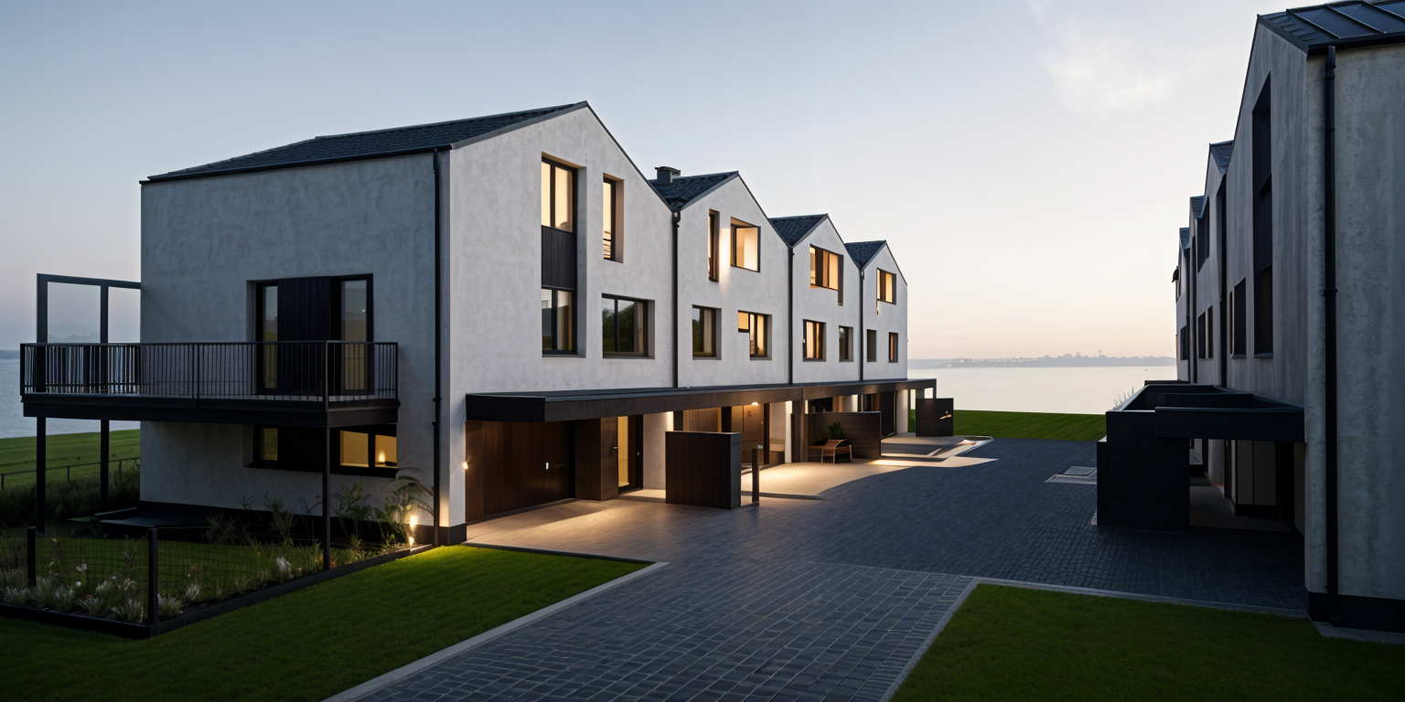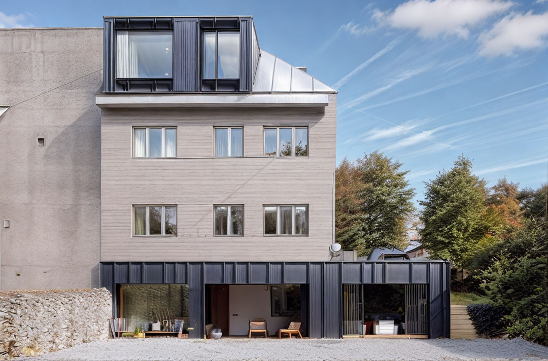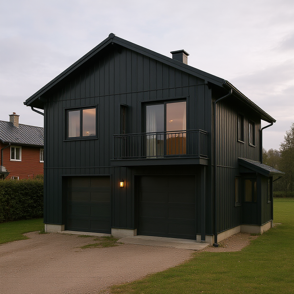 can you correct the exsterior to match skandinavian style with a roof that drops wodn to the foundation and glass garage doors 2 car door and a balconey