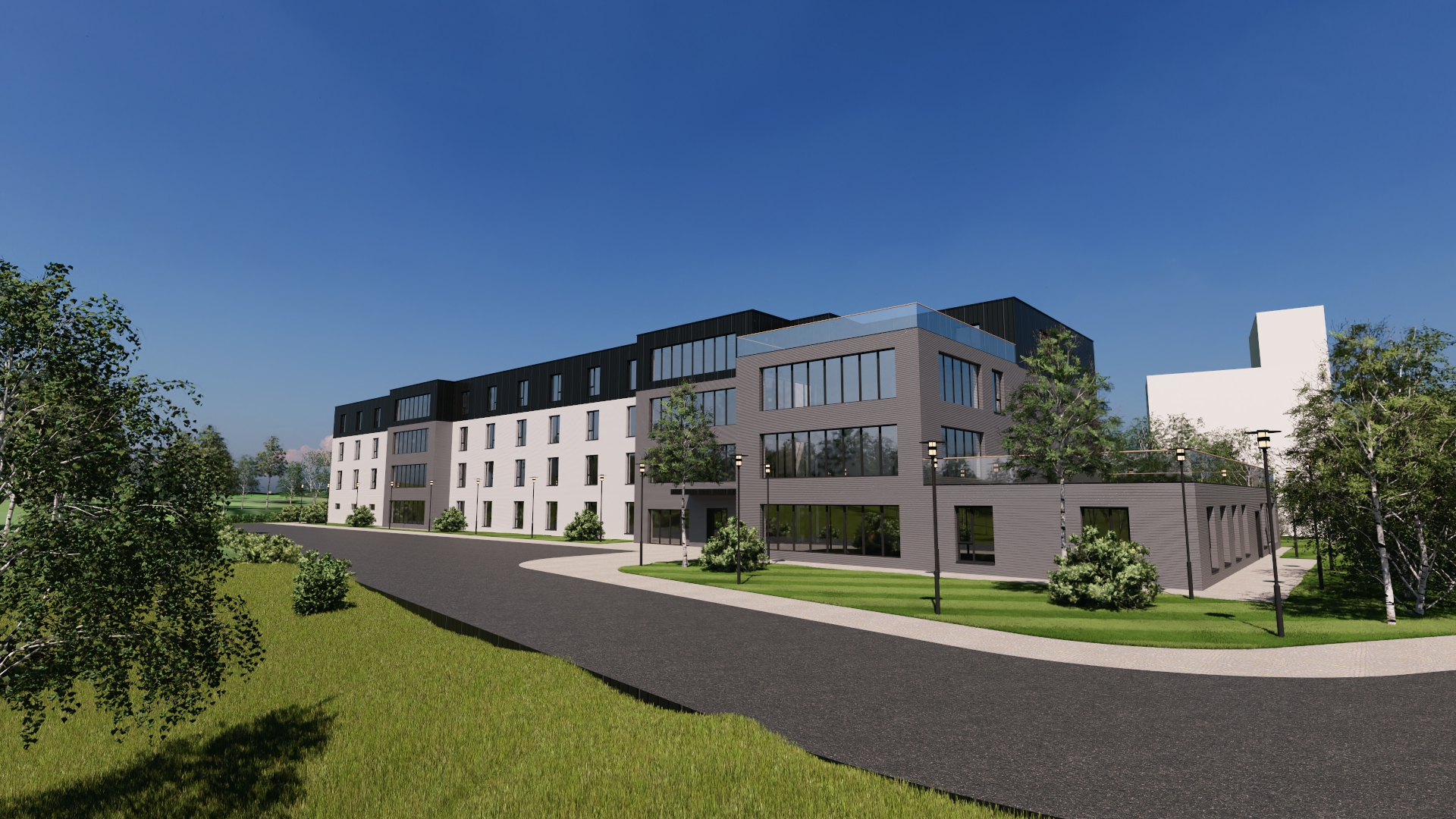 summer draw parking lines on asphalt in front of building wet road rhenzinc top of building light up interiors