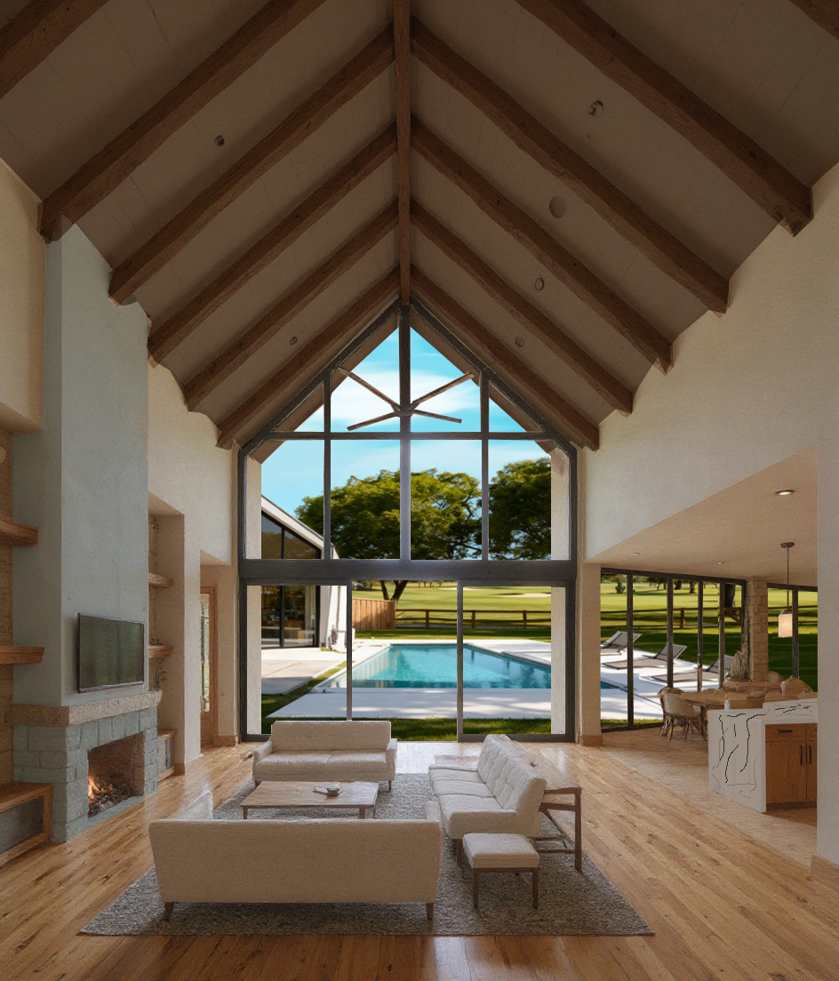 stone fireplace deep tone wood vaulted ceiling and floor granite table