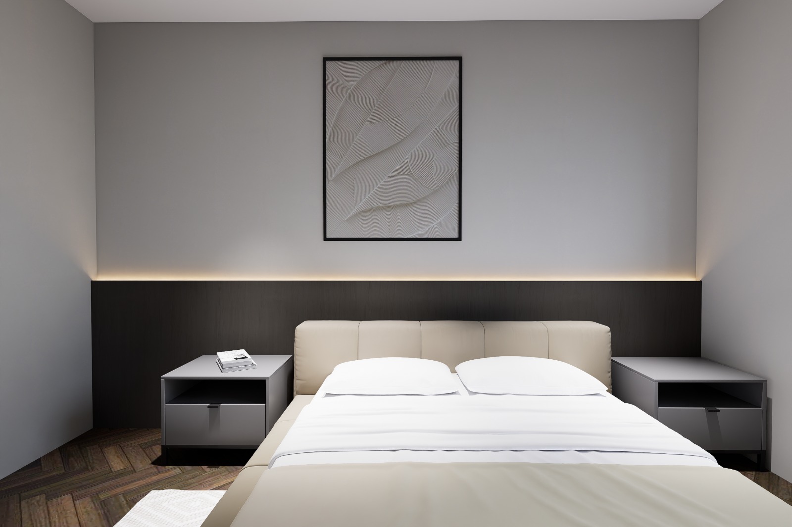 ultra realistic modern luxury bedroom interior maintain the exact bed geometry and design from the original render a low upholstered bed with segmented padded headboard and base finished in soft warm beige fabric upholstery with realistic textile material and subtle stitching apply a warm modern neutral color palette inspired by high end interior design warm beige soft cream sand tones and light natural oak wood accents walls in soft warm off white cream paint with smooth matte finish behind the bed create a modern wall composition a horizontal dark warm wood panel headboard wall with integrated warm led strip lighting running across the wall creating soft ambient glow add minimal floating bedside tables in matte off white or light beige lacquer with realistic materials and subtle reflections install sheer floor to ceiling curtains at the window light linen fabric in warm white slightly translucent softly diffusing natural daylight curtains should hang naturally with realistic folds and fabric physics lighting should be soft warm architectural lighting recessed ceiling linear spotlights hidden led strip behind the headboard panel natural daylight entering through the window and diffused by curtains use high quality physically based materials pbr for fabrics wood walls and floor floor in natural warm oak wood planks with realistic grain add a large textured neutral beige rug under the bed bedding should be luxury hotel style with layered blankets in soft beige and cream tones natural fabric wrinkles and folds rendering style photorealistic architectural visualization global illumination soft shadows high dynamic range lighting cinematic interior photography ultra detailed textures 8k realism interior design magazine quality