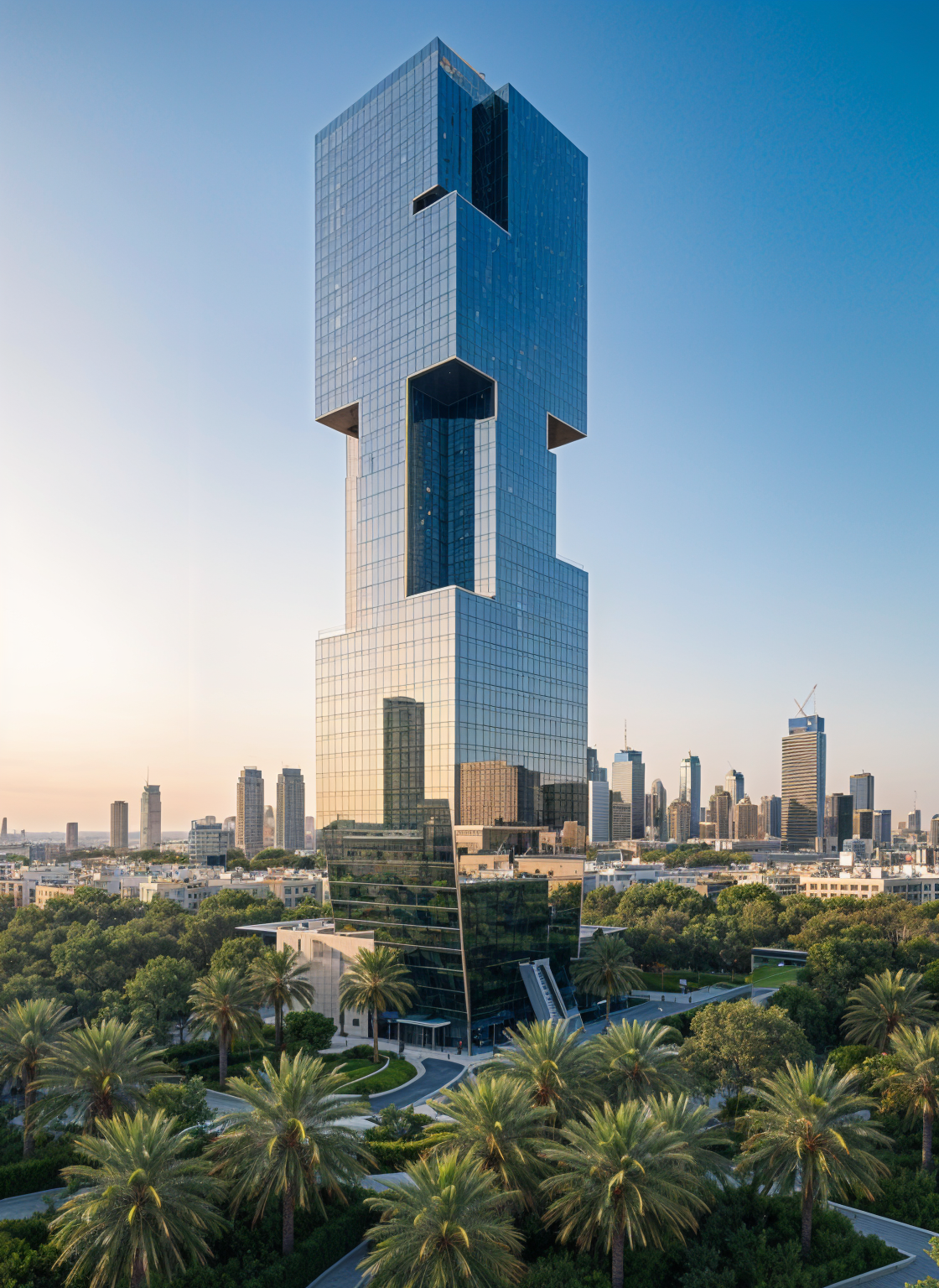 bobby mcalpine exterior shot 437 the building will resemble the model in the photo without any additions or new structures it will be entirely made of glass and steel have 50 floors and its exterior will feature mirrored glass that reflects the urban environment of dubai where the building will be integrated it will be situated on a secluded plot in the heart of the city s administrative and economic center the vegetation will be lush and abundant with palm trees as the main feature architecture